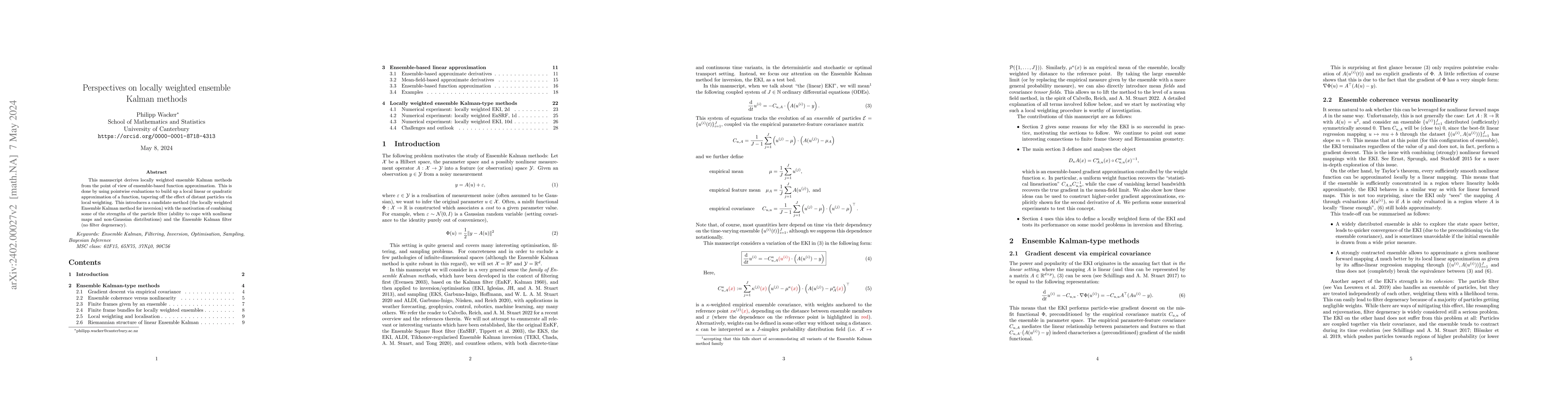 This manuscript derives locally weighted ensemble Kalman methods from the point of view of ensemble-based function approximation. This is done by using pointwise evaluations to build up a local linear or quadratic approximation of a function, tapering off the effect of distant particles via local weighting. This introduces a candidate method (the locally weighted Ensemble Kalman method for inversion) with the motivation of combining some of the strengths of the particle filter (ability to cope with nonlinear maps and non-Gaussian distributions) and the Ensemble Kalman filter (no filter degeneracy).