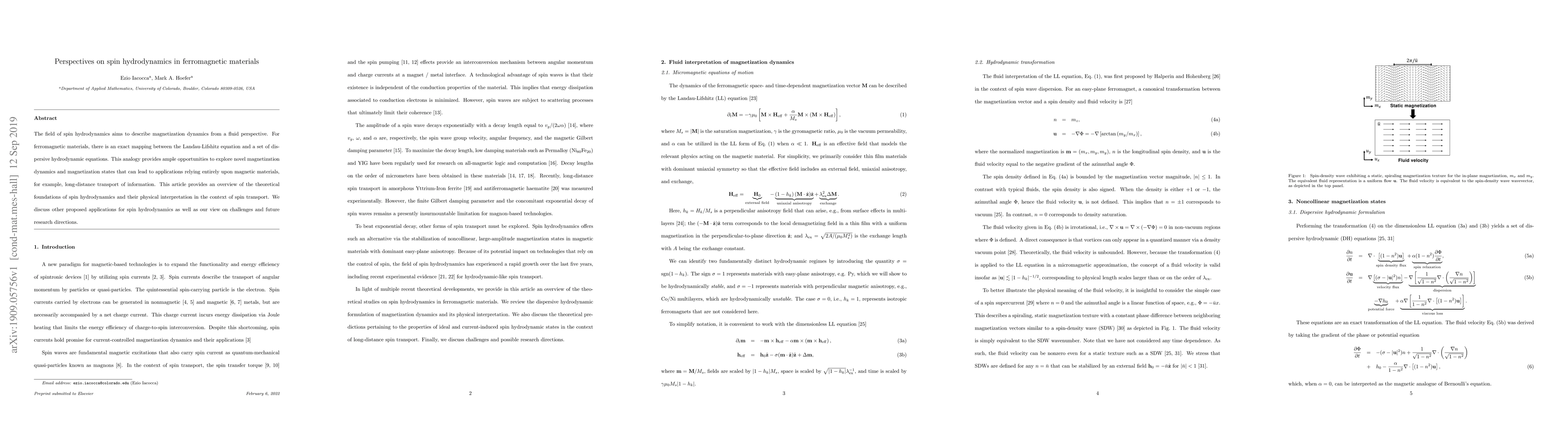 The field of spin hydrodynamics aims to describe magnetization dynamics from a fluid perspective. For ferromagnetic materials, there is an exact mapping between the Landau-Lifshitz equation and a set of dispersive hydrodynamic equations. This analogy provides ample opportunities to explore novel magnetization dynamics and magnetization states that can lead to applications relying entirely upon magnetic materials, for example, long-distance transport of information. This article provides an overview of the theoretical foundations of spin hydrodynamics and their physical interpretation in the context of spin transport. We discuss other proposed applications for spin hydrodynamics as well as our view on challenges and future research directions.