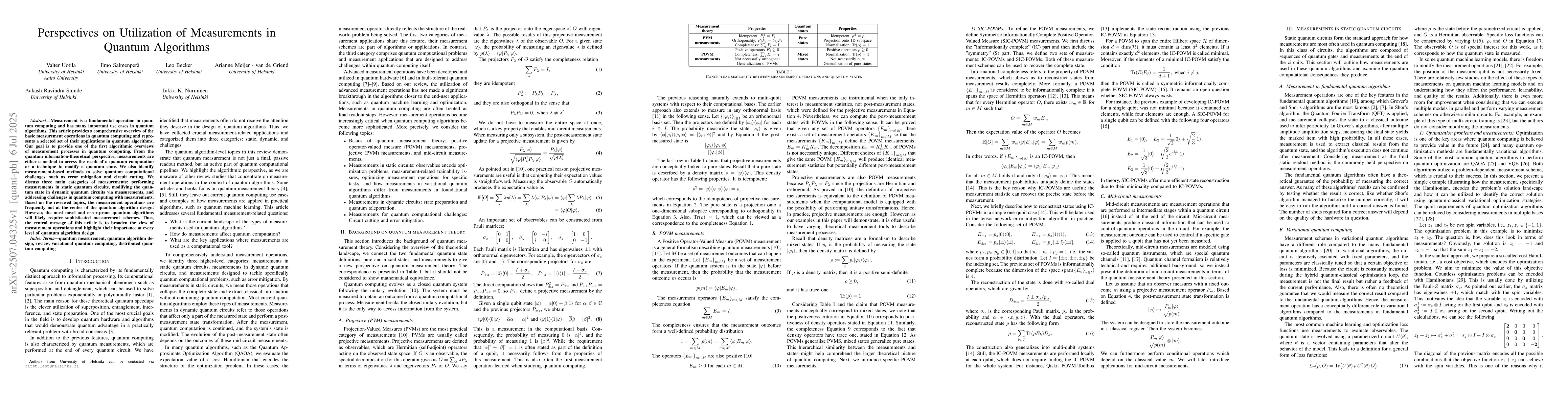 Measurement is a fundamental operation in quantum computing and has many important use cases in quantum algorithms. This article provides a comprehensive overview of the basic measurement operations in quantum computing and represents a selected set of their applications in quantum algorithms. Our goal is to provide one of the first algorithmic overviews of measurement processes in quantum computing. From the quantum information-theoretical perspective, measurements are either a method to access the result of a quantum computation or a technique to modify a quantum state. We also identify measurement-based methods to solve quantum computational challenges, such as error mitigation and circuit cutting. We discuss three main categories of measurements: performing measurements in static quantum circuits, modifying the quantum state in dynamic quantum circuits via measurements, and addressing challenges in quantum computing with measurements. Based on the reviewed topics, the measurement operations are frequently not at the center of the quantum algorithm design. However, the most novel and error-prone quantum algorithms will likely require sophisticated measurement schemes. Thus, the central message of this article is to broaden the view of measurement operations and highlight their importance at every level of quantum algorithm design.