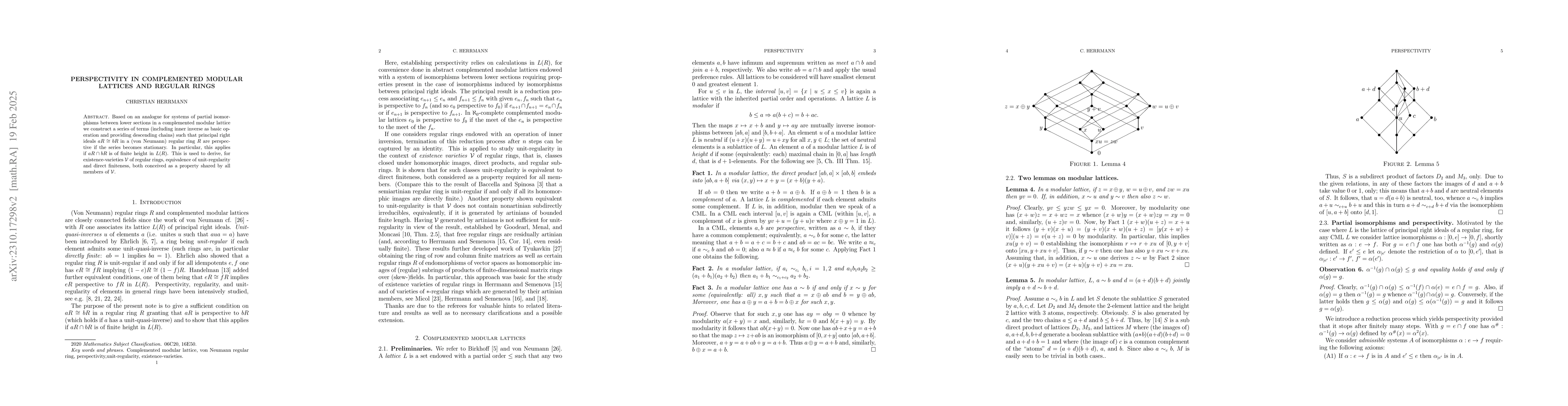 Based on an analogue for systems of partial isomorphisms between lower sections in a complemented modular lattice we prove that principal right ideals $aR \cong bR$ in a (von Neumann) regular ring $R$ are perspective if $aR \cap bR$ is of finite height in $L(R)$. This is applied to derive, for existence-varieties $\mathcal{V}$ of regular rings, equivalence of unit-regularity and direct finiteness, both conceived as a property shared by all members of $\mathcal{V}$.