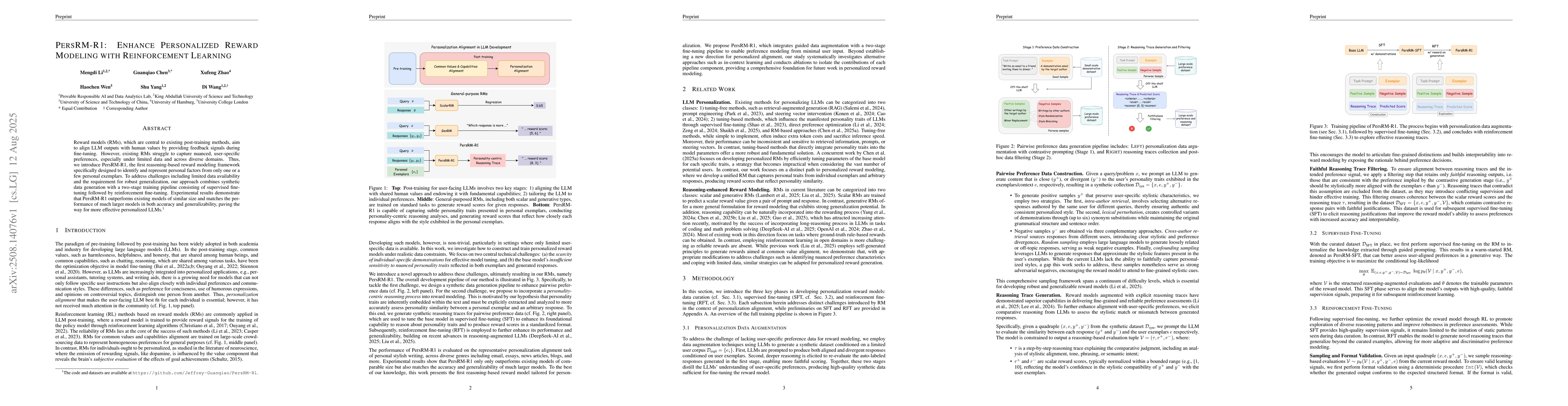 Reward models (RMs), which are central to existing post-training methods, aim to align LLM outputs with human values by providing feedback signals during fine-tuning. However, existing RMs struggle to capture nuanced, user-specific preferences, especially under limited data and across diverse domains. Thus, we introduce PersRM-R1, the first reasoning-based reward modeling framework specifically designed to identify and represent personal factors from only one or a few personal exemplars. To address challenges including limited data availability and the requirement for robust generalization, our approach combines synthetic data generation with a two-stage training pipeline consisting of supervised fine-tuning followed by reinforcement fine-tuning. Experimental results demonstrate that PersRM-R1 outperforms existing models of similar size and matches the performance of much larger models in both accuracy and generalizability, paving the way for more effective personalized LLMs.