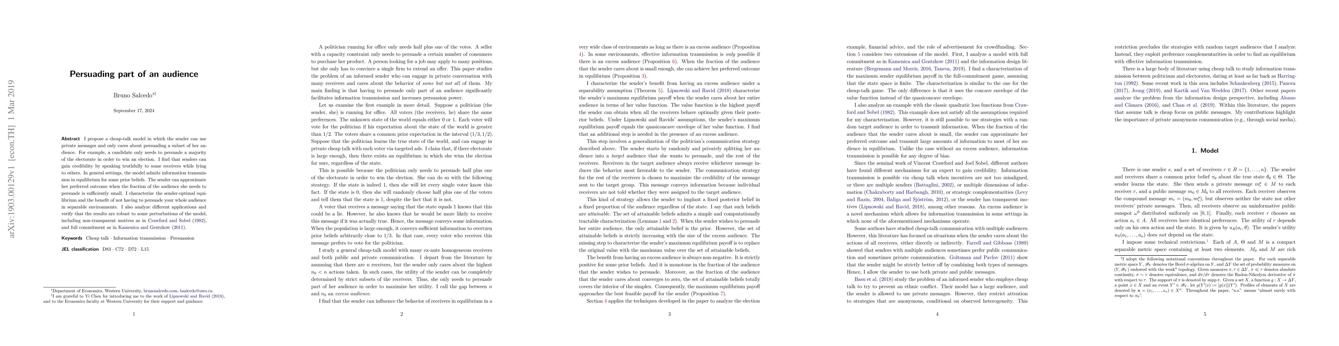 This paper develops a cheap-talk model where the sender aims to persuade only a subset of the audience, demonstrating that senders can gain credibility by selectively telling the truth or lying. The model shows that senders can achieve preferred outcomes when only a small fraction of the audience needs to be persuaded.