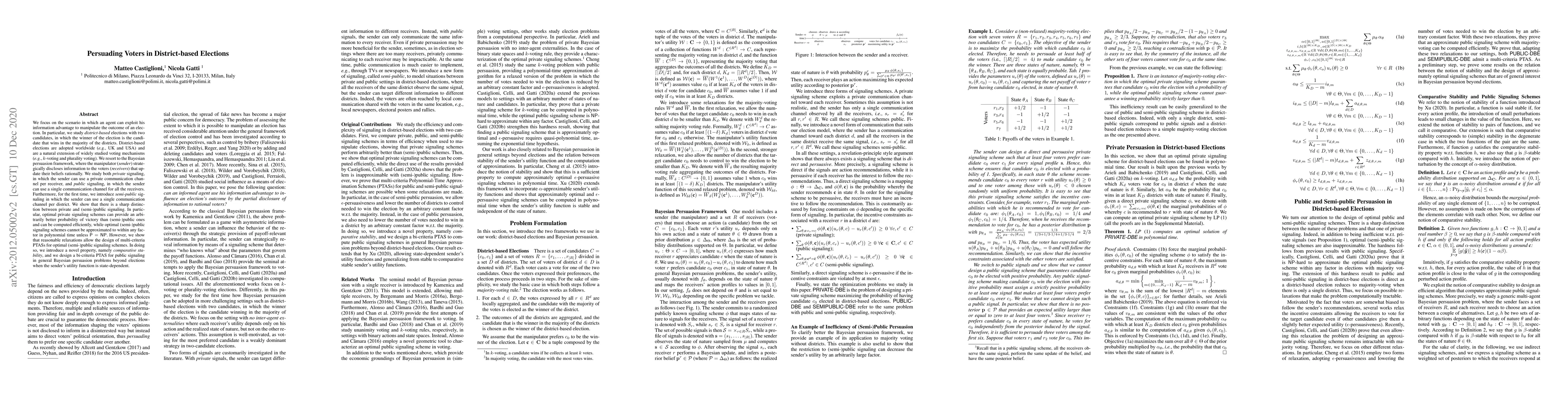We focus on the scenario in which an agent can exploit his information advantage to manipulate the outcome of an election. In particular, we study district-based elections with two candidates, in which the winner of the election is the candidate that wins in the majority of the districts. District-based elections are adopted worldwide (e.g., UK and USA) and are a natural extension of widely studied voting mechanisms (e.g., k-voting and plurality voting). We resort to the Bayesian persuasion framework, where the manipulator (sender) strategically discloses information to the voters (receivers) that update their beliefs rationally. We study both private signaling, in which the sender can use a private communication channel per receiver, and public signaling, in which the sender can use a single communication channel for all the receivers. Furthermore, for the first time, we introduce semi-public signaling in which the sender can use a single communication channel per district. We show that there is a sharp distinction between private and (semi-)public signaling. In particular, optimal private signaling schemes can provide an arbitrarily better probability of victory than (semi-)public ones and can be computed efficiently, while optimal (semi-)public signaling schemes cannot be approximated to within any factor in polynomial time unless P=NP. However, we show that reasonable relaxations allow the design of multi-criteria PTASs for optimal (semi-)public signaling schemes. In doing so, we introduce a novel property, namely comparative stability, and we design a bi-criteria PTAS for public signaling in general Bayesian persuasion problems beyond elections when the sender's utility function is state-dependent.