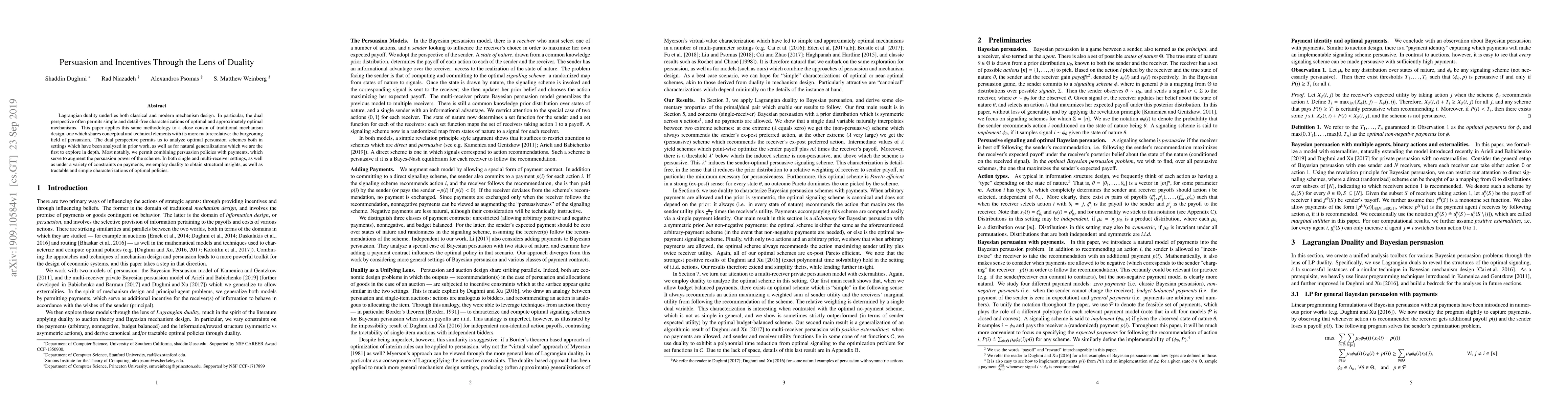 Lagrangian duality underlies both classical and modern mechanism design. In particular, the dual perspective often permits simple and detail-free characterizations of optimal and approximately optimal mechanisms. This paper applies this same methodology to a close cousin of traditional mechanism design, one which shares conceptual and technical elements with its more mature relative: the burgeoning field of persuasion. The dual perspective permits us to analyze optimal persuasion schemes both in settings which have been analyzed in prior work, as well as for natural generalizations which we are the first to explore in depth. Most notably, we permit combining persuasion policies with payments, which serve to augment the persuasion power of the scheme. In both single and multi-receiver settings, as well as under a variety of constraints on payments, we employ duality to obtain structural insights, as well as tractable and simple characterizations of optimal policies.