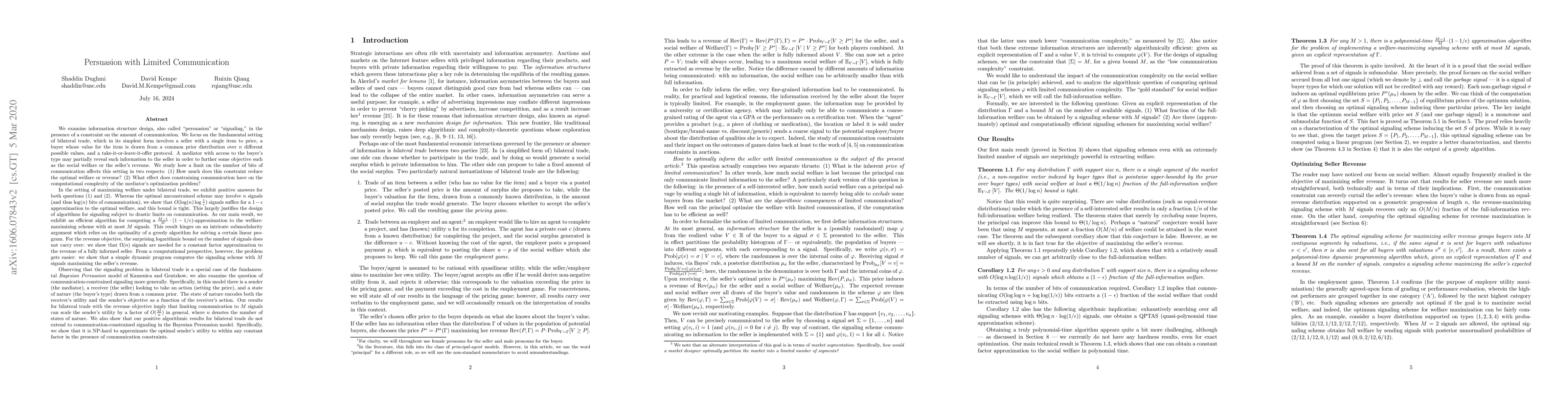 We examine information structure design, also called "persuasion" or "signaling", in the presence of a constraint on the amount of communication. We focus on the fundamental setting of bilateral trade, which in its simplest form involves a seller with a single item to price, a buyer whose value for the item is drawn from a common prior distribution over $n$ different possible values, and a take-it-or-leave-it-offer protocol. A mediator with access to the buyer's type may partially reveal such information to the seller in order to further some objective such as the social welfare or the seller's revenue. In the setting of maximizing welfare under bilateral trade, we show that $O(\log(n) \log \frac{1}{\epsilon})$ signals suffice for a $1-\epsilon$ approximation to the optimal welfare, and this bound is tight. As our main result, we exhibit an efficient algorithm for computing a $\frac{M-1}{M} \cdot (1-1/e)$-approximation to the welfare-maximizing scheme with at most M signals. For the revenue objective, we show that $\Omega(n)$ signals are needed for a constant factor approximation to the revenue of a fully informed seller. From a computational perspective, however, the problem gets easier: we show that a simple dynamic program computes the signaling scheme with M signals maximizing the seller's revenue. Observing that the signaling problem in bilateral trade is a special case of the fundamental Bayesian Persuasion model of Kamenica and Gentzkow, we also examine the question of communication-constrained signaling more generally. In this model there is a sender (the mediator), a receiver (the seller) looking to take an action (setting the price), and a state of nature (the buyer's type) drawn from a common prior. We show that it is NP-hard to approximate the optimal sender's utility to within any constant factor in the presence of communication constraints.