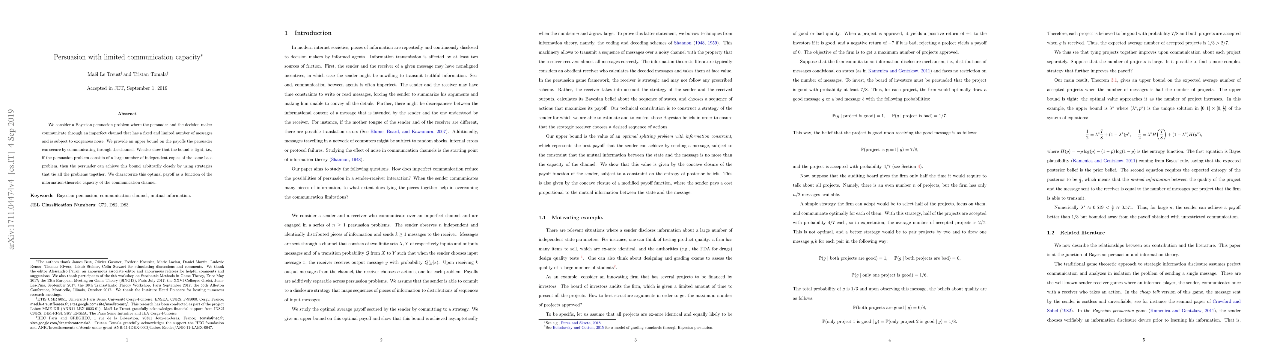 This paper studies a Bayesian persuasion problem with a limited and noisy communication channel, providing an upper bound on the persuader's achievable payoffs and demonstrating that the bound is tight for large, independent problem instances. The optimal payoff is characterized as a function of the channel's information-theoretic capacity.