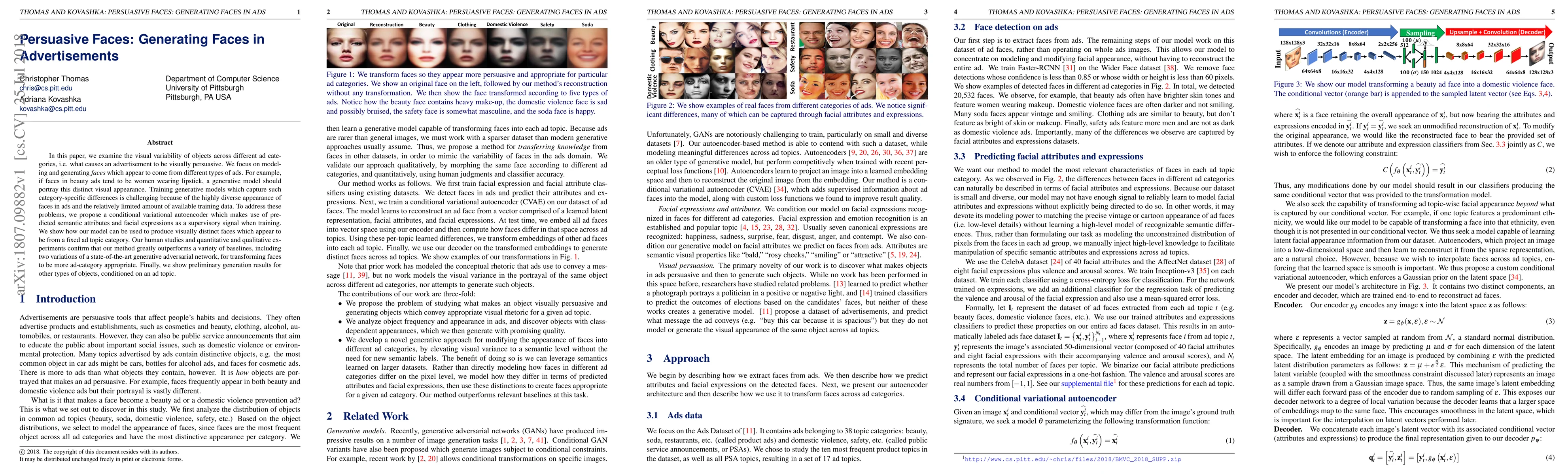 In this paper, we examine the visual variability of objects across different ad categories, i.e. what causes an advertisement to be visually persuasive. We focus on modeling and generating faces which appear to come from different types of ads. For example, if faces in beauty ads tend to be women wearing lipstick, a generative model should portray this distinct visual appearance. Training generative models which capture such category-specific differences is challenging because of the highly diverse appearance of faces in ads and the relatively limited amount of available training data. To address these problems, we propose a conditional variational autoencoder which makes use of predicted semantic attributes and facial expressions as a supervisory signal when training. We show how our model can be used to produce visually distinct faces which appear to be from a fixed ad topic category. Our human studies and quantitative and qualitative experiments confirm that our method greatly outperforms a variety of baselines, including two variations of a state-of-the-art generative adversarial network, for transforming faces to be more ad-category appropriate. Finally, we show preliminary generation results for other types of objects, conditioned on an ad topic.