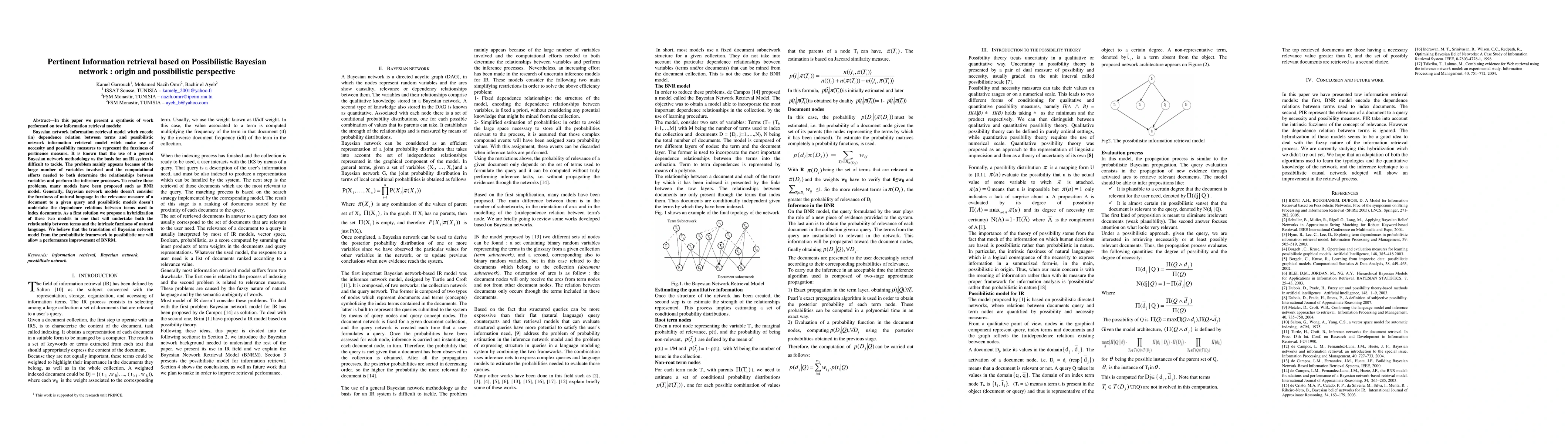 This paper synthesizes two information retrieval models: a Bayesian network model that encodes term dependencies and a possibilistic network that uses necessity and possibility measures to handle linguistic fuzziness. The authors propose a hybrid model to address computational challenges and incorporate both term relationships and natural language fuzziness for improved performance.