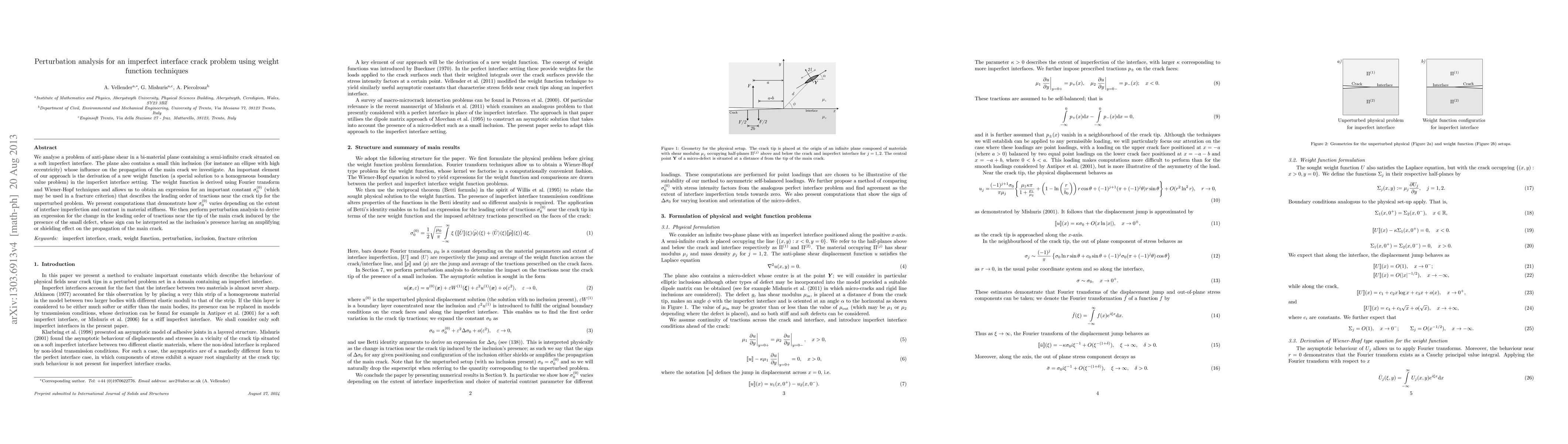 We analyse a problem of anti-plane shear in a bi-material plane containing a semi-infinite crack situated on a soft imperfect interface. The plane also contains a small thin inclusion (for instance an ellipse with high eccentricity) whose influence on the propagation of the main crack we investigate. An important element of our approach is the derivation of a new weight function (a special solution to a homogeneous boundary value problem) in the imperfect interface setting. The weight function is derived using Fourier transform and Wiener-Hopf techniques and allows us to obtain an expression for an important constant (which may be used in a fracture criterion) that describes the leading order of tractions near the crack tip for the unperturbed problem. We present computations that demonstrate how this constant varies depending on the extent of interface imperfection and contrast in material stiffness. We then perform perturbation analysis to derive an expression for the change in the leading order of tractions near the tip of the main crack induced by the presence of the small defect, whose sign can be interpreted as the inclusion's presence having an amplifying or shielding effect on the propagation of the main crack.
