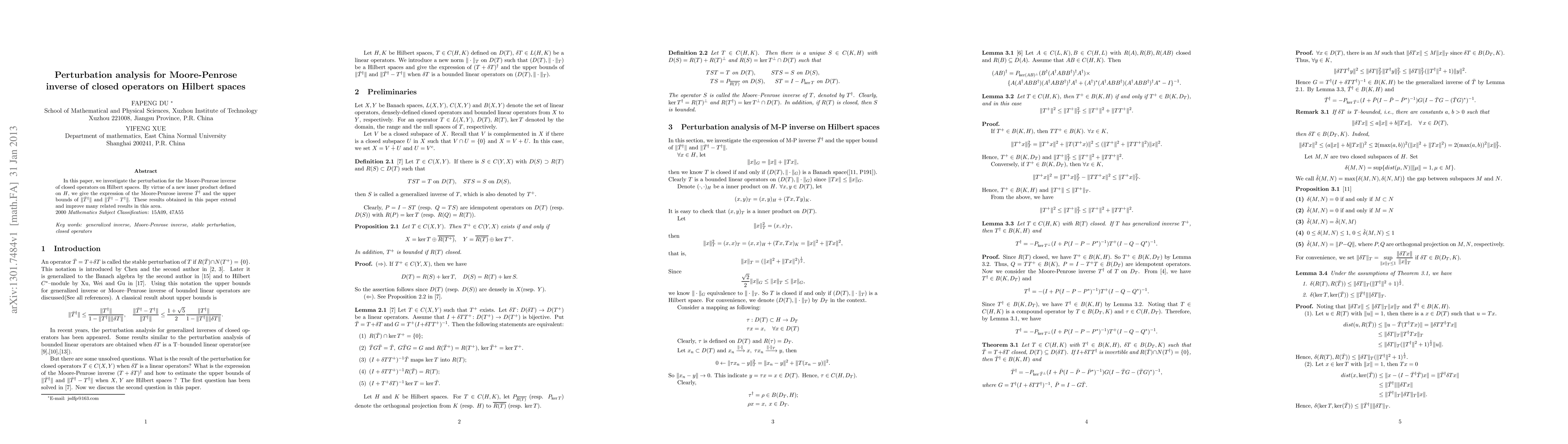 In this paper, we investigate the perturbation for the Moore-Penrose inverse of closed operators on Hilbert spaces. By virtue of a new inner product defined on $H$, we give the expression of the Moore-Penrose inverse $\bar{T}^\dag$ and the upper bounds of $\|\bar{T}^\dag\|$ and $\|\bar{T}^\dag -T^\dag\|$. These results obtained in this paper extend and improve many related results in this area.