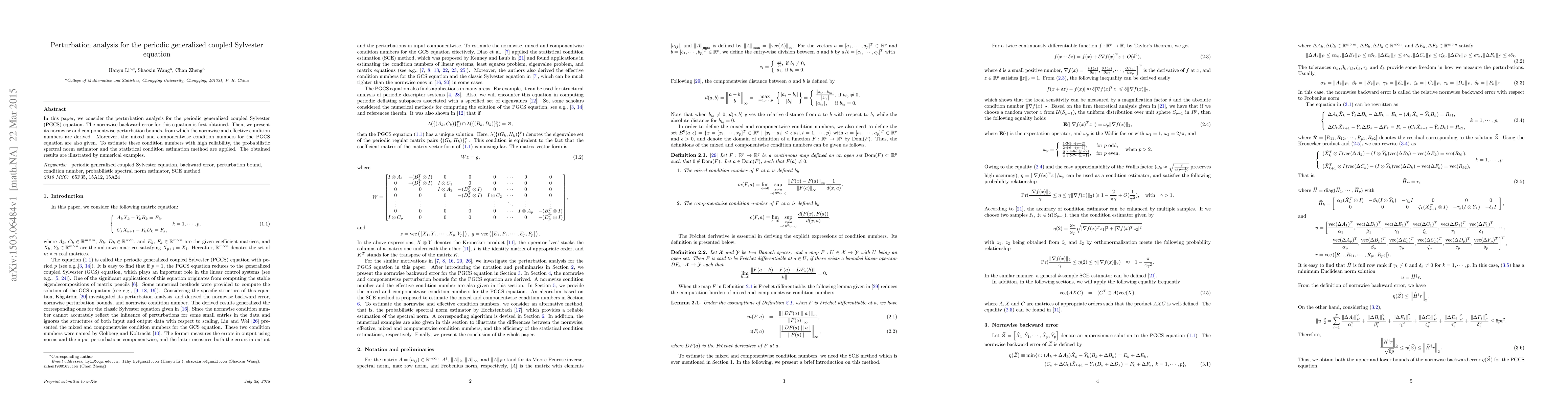 This paper analyzes the perturbation analysis for the periodic generalized coupled Sylvester equation, deriving bounds on condition numbers using normwise and componentwise methods, and estimating them with probabilistic spectral norm estimator and statistical condition estimation method.
