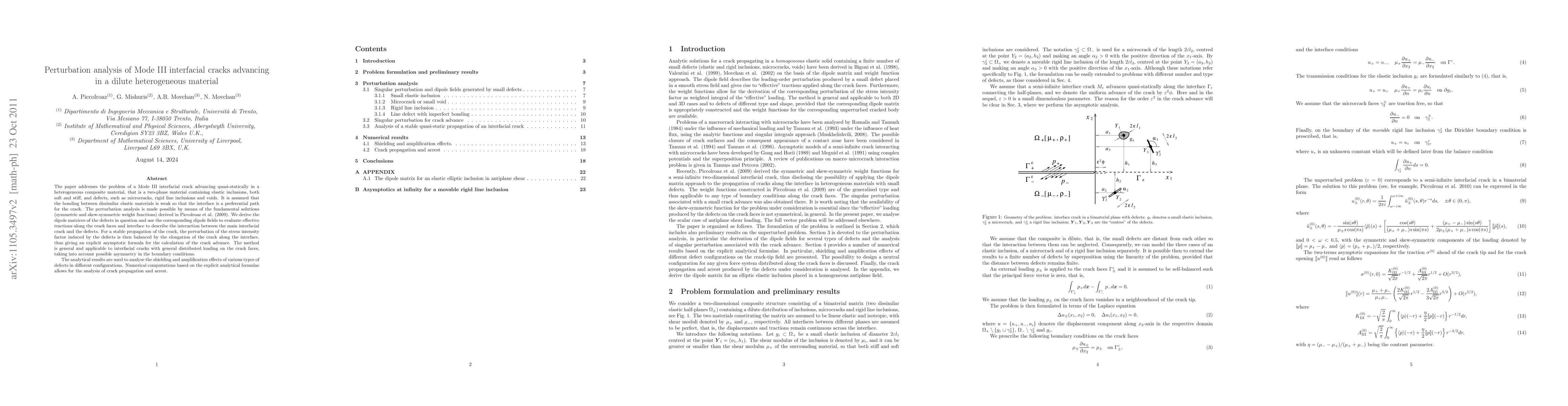 This paper investigates Mode III interfacial crack propagation in heterogeneous composite materials using perturbation analysis. It derives dipole matrices for various defects and uses them to evaluate effective tractions, providing an explicit formula for crack advance and analyzing shielding and amplification effects of different defects.