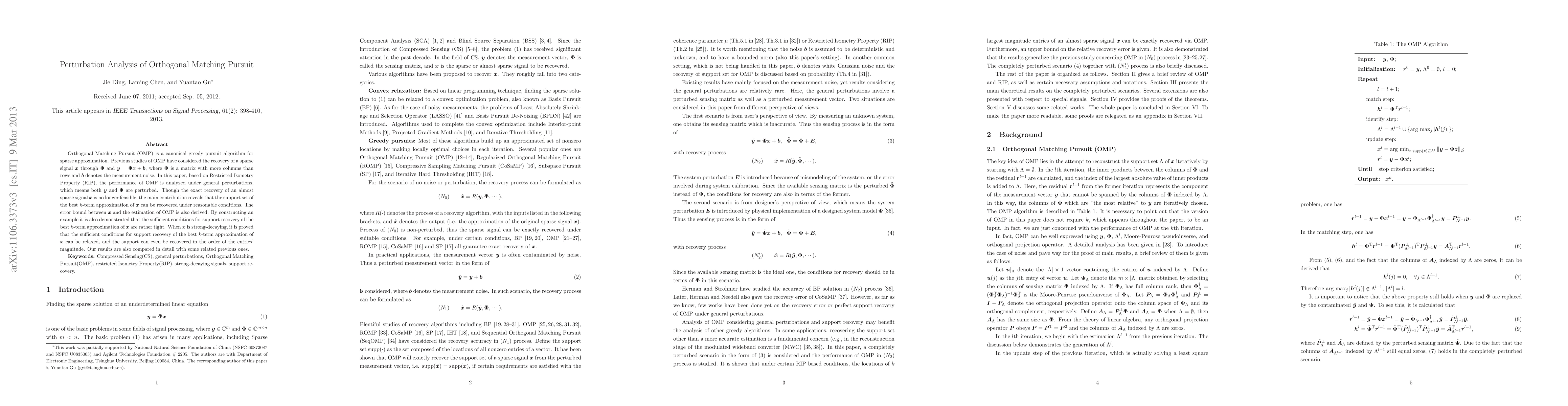 This paper analyzes Orthogonal Matching Pursuit (OMP), a greedy algorithm for sparse approximation, under perturbations in both the measurement vector y and the dictionary matrix Phi. Despite exact recovery of a perturbed signal x not always being possible, the study guarantees exact location recovery of the k largest magnitude entries of x under certain conditions. The error in OMP's solution is estimated, and tightness of these conditions is demonstrated via an example. For strong-decaying signals, the conditions can be relaxed, enabling ordered recovery of entries by magnitude.