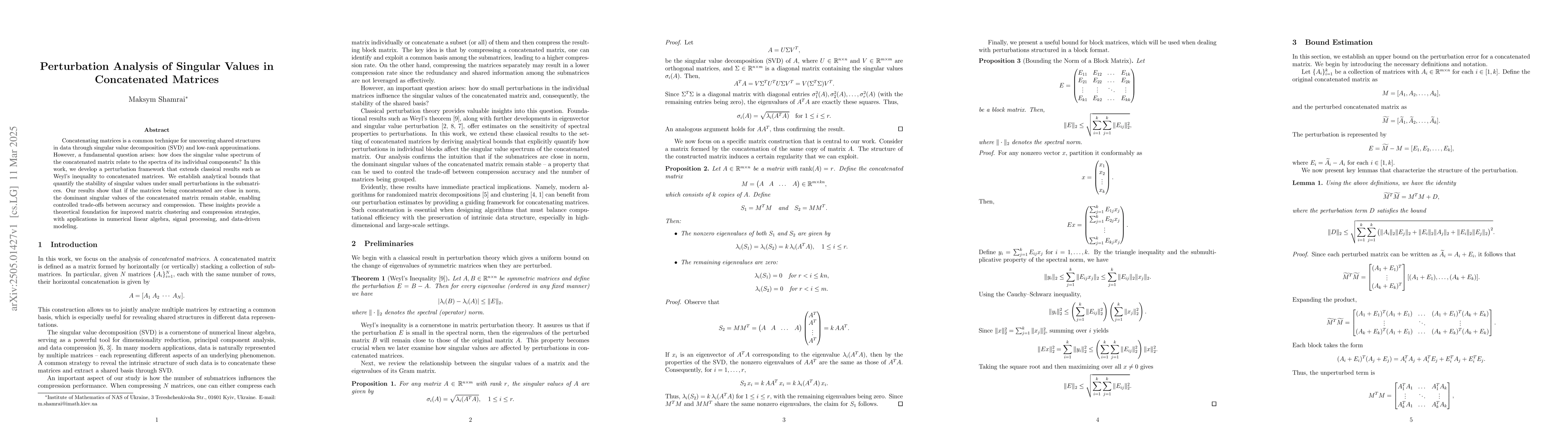The paper presents a perturbation analysis framework for singular values in concatenated matrices, extending classical results and providing novel bounds for stability under small perturbations.