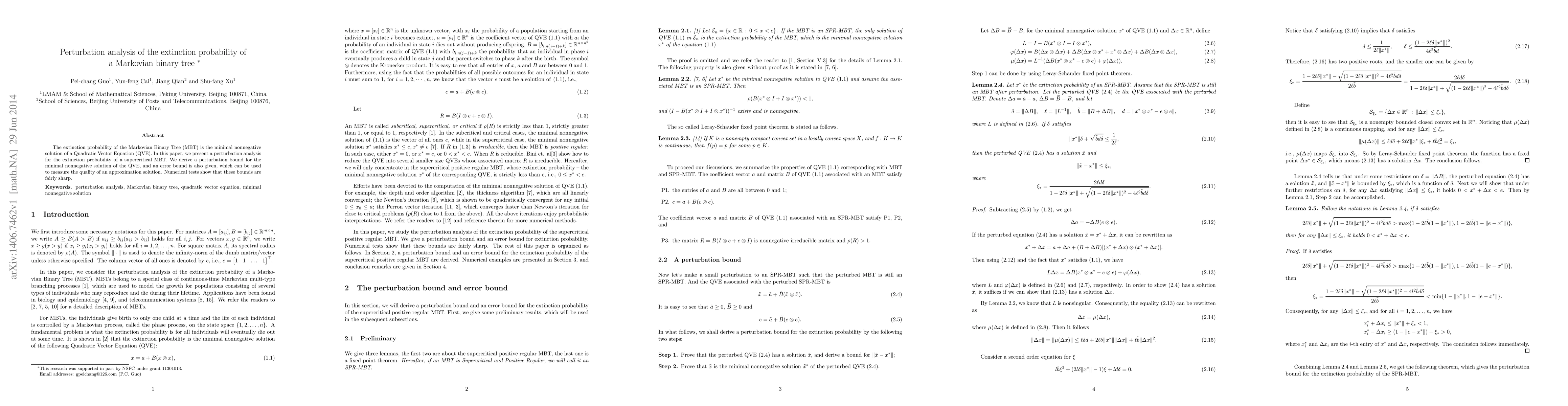The extinction probability of the Markovian Binary Tree (MBT) is the minimal nonnegative solution of a Quadratic Vector Equation (QVE). In this paper, we present a perturbation analysis for the extinction probability of a supercritical MBT. We derive a perturbation bound for the minimal nonnegative solution of the QVE, and an error bound is also given, which can be used to measure the quality of an approximation solution. Numerical tests show that these bounds are fairly sharp.