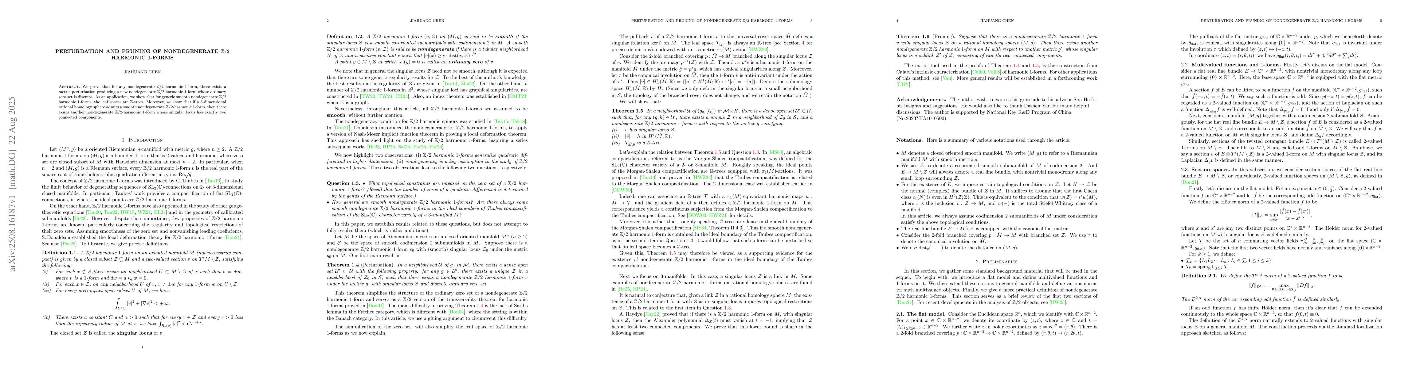 We prove that for any nondegenerate $\mathbb{Z}/2$ harmonic $1$-form, there exists a metric perturbation producing a new nondegenerate $\mathbb{Z}/2$ harmonic $1$-form whose ordinary zero set is discrete. As an application, we show that for generic smooth nondegenerate $\mathbb{Z}/2$ harmonic $1$-forms, the leaf spaces are $\mathbb{Z}$-trees. Moreover, we show that if a $3$-dimensional rational homology sphere admits a smooth nondegenerate $\mathbb{Z}/2$-harmonic $1$-form, then there exists another nondegenerate $\mathbb{Z}/2$-harmonic $1$-form whose singular locus has exactly two connected components.