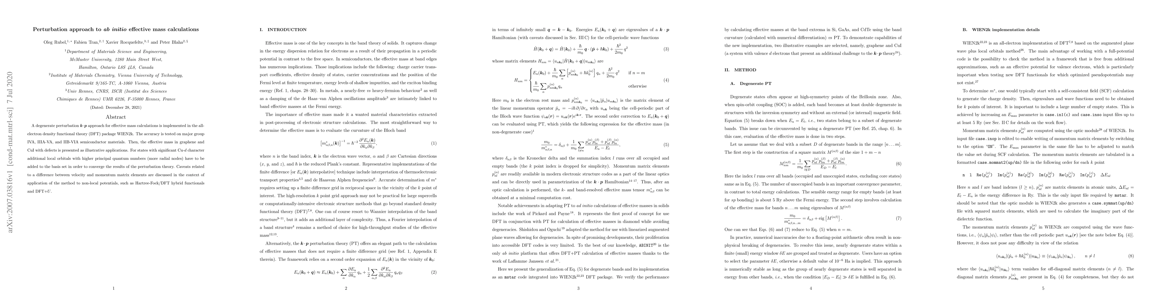 A degenerate perturbation $k\cdot p$ approach for effective mass calculations is implemented in the all-electron density functional theory (DFT) package WIEN2k. The accuracy is tested on major group IVA, IIIA-VA, and IIB-VIA semiconductor materials. Then, the effective mass in graphene and CuI with defects is presented as illustrative applications. For states with significant Cu-d character additional local orbitals with higher principal quantum numbers (more radial nodes) have to be added to the basis set in order to converge the results of the perturbation theory. Caveats related to a difference between velocity and momentum matrix elements are discussed in the context of application of the method to non-local potentials, such as Hartree-Fock/DFT hybrid functionals and DFT+U.