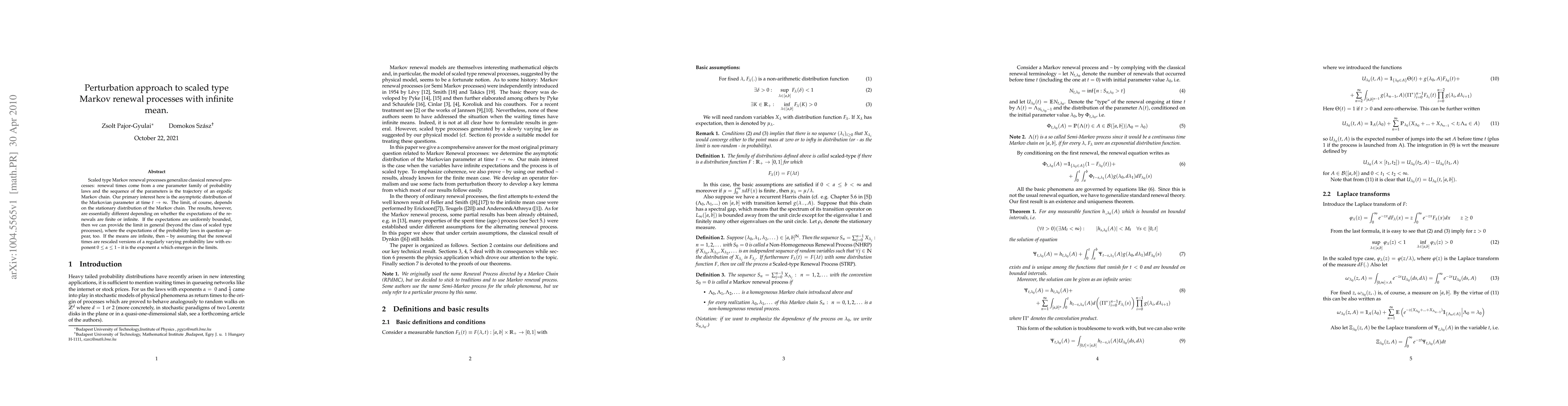 Scaled type Markov renewal processes generalize classical renewal processes: renewal times come from a one parameter family of probability laws and the sequence of the parameters is the trajectory of an ergodic Markov chain. Our primary interest here is the asymptotic distribution of the Markovian parameter at time t \to \infty. The limit, of course, depends on the stationary distribution of the Markov chain. The results, however, are essentially different depending on whether the expectations of the renewals are finite or infinite. If the expectations are uniformly bounded, then we can provide the limit in general (beyond the class of scaled type processes), where the expectations of the probability laws in question appear, too. If the means are infinite, then - by assuming that the renewal times are rescaled versions of a regularly varying probability law with exponent 0 \leq alpha \leq 1 - it is the exponent a which emerges in the limits.