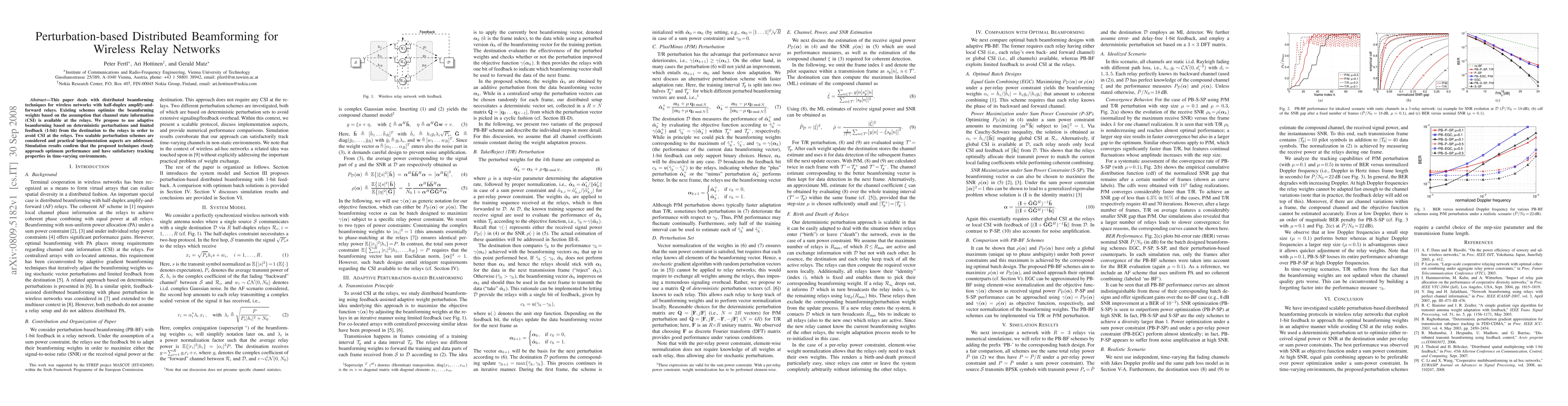 This paper proposes adaptive beamforming techniques for wireless relay networks using perturbation-based methods and 1-bit feedback, eliminating the need for channel state information at relays. Simulation results show the proposed methods achieve near-optimal performance and effective tracking in dynamic environments.
