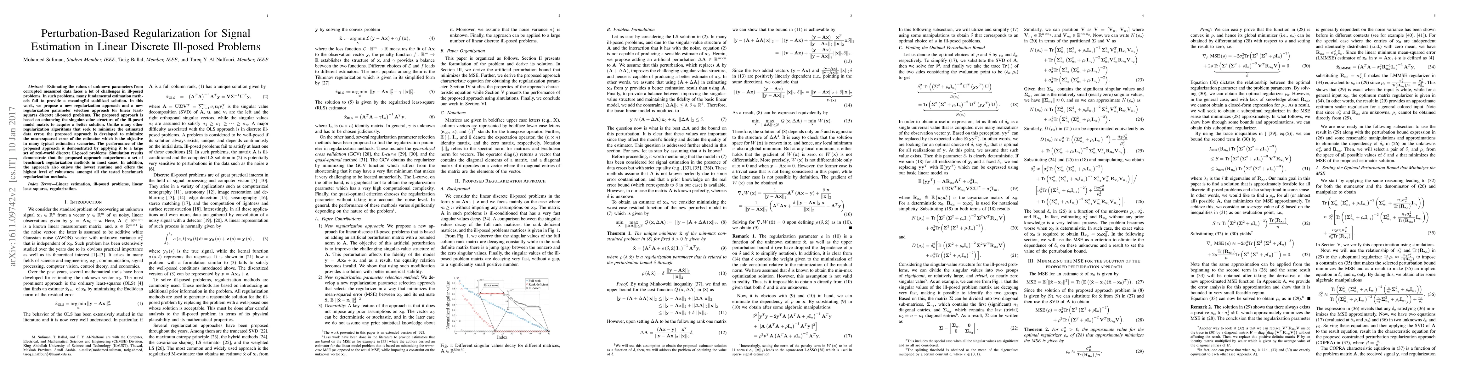 Estimating the values of unknown parameters from corrupted measured data faces a lot of challenges in ill-posed problems. In such problems, many fundamental estimation methods fail to provide a meaningful stabilized solution. In this work, we propose a new regularization approach and a new regularization parameter selection approach for linear least-squares discrete ill-posed problems. The proposed approach is based on enhancing the singular-value structure of the ill-posed model matrix to acquire a better solution. Unlike many other regularization algorithms that seek to minimize the estimated data error, the proposed approach is developed to minimize the mean-squared error of the estimator which is the objective in many typical estimation scenarios. The performance of the proposed approach is demonstrated by applying it to a large set of real-world discrete ill-posed problems. Simulation results demonstrate that the proposed approach outperforms a set of benchmark regularization methods in most cases. In addition, the approach also enjoys the lowest runtime and offers the highest level of robustness amongst all the tested benchmark regularization methods.