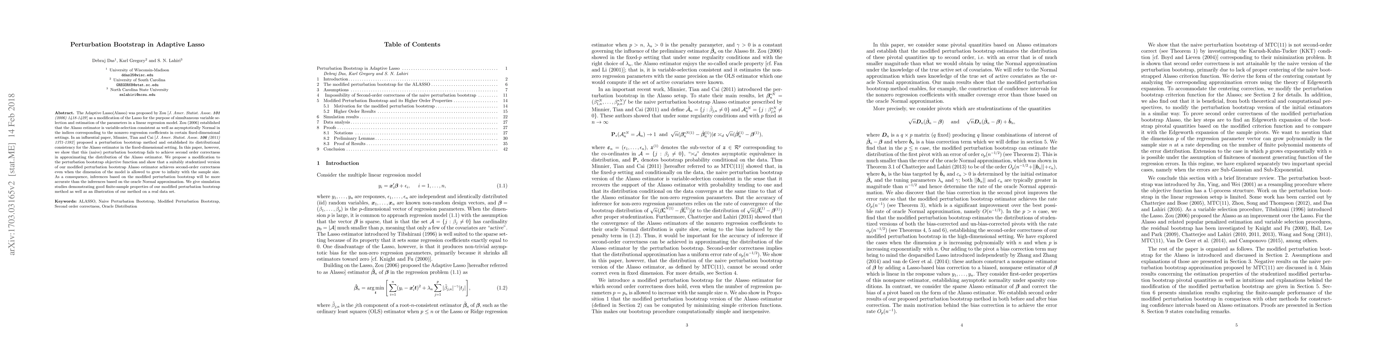 This paper addresses the limitations of the perturbation bootstrap method for the Adaptive Lasso (Alasso) estimator, demonstrating its failure in achieving second-order correctness. It proposes a modified perturbation bootstrap approach that achieves second-order accuracy even when the model dimension grows with the sample size, leading to more accurate inferences compared to the oracle Normal approximation, as shown through simulation studies and a real data example.