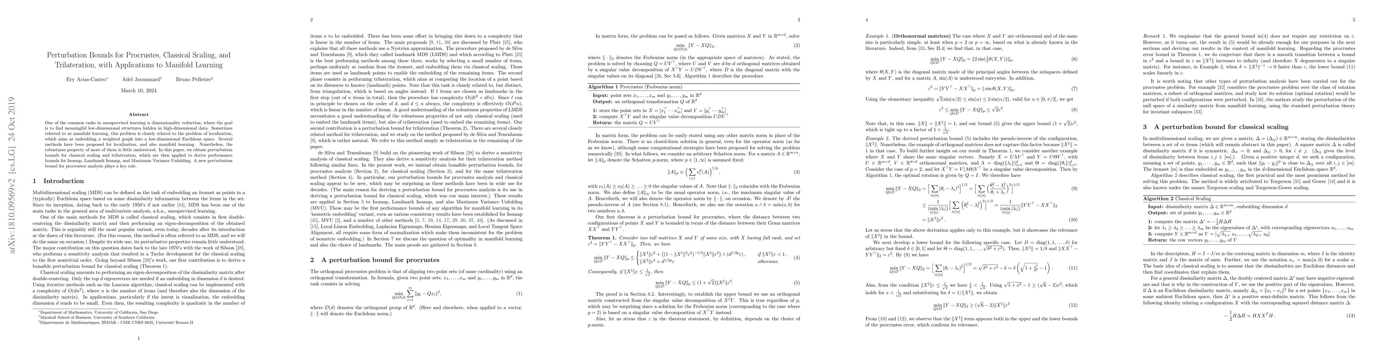 This paper derives perturbation bounds for Procrustes analysis, classical scaling, and trilateration, providing insights into the robustness of these methods. These bounds are applied to establish performance guarantees for manifold learning techniques like Isomap, Landmark Isomap, and Maximum Variance Unfolding.
