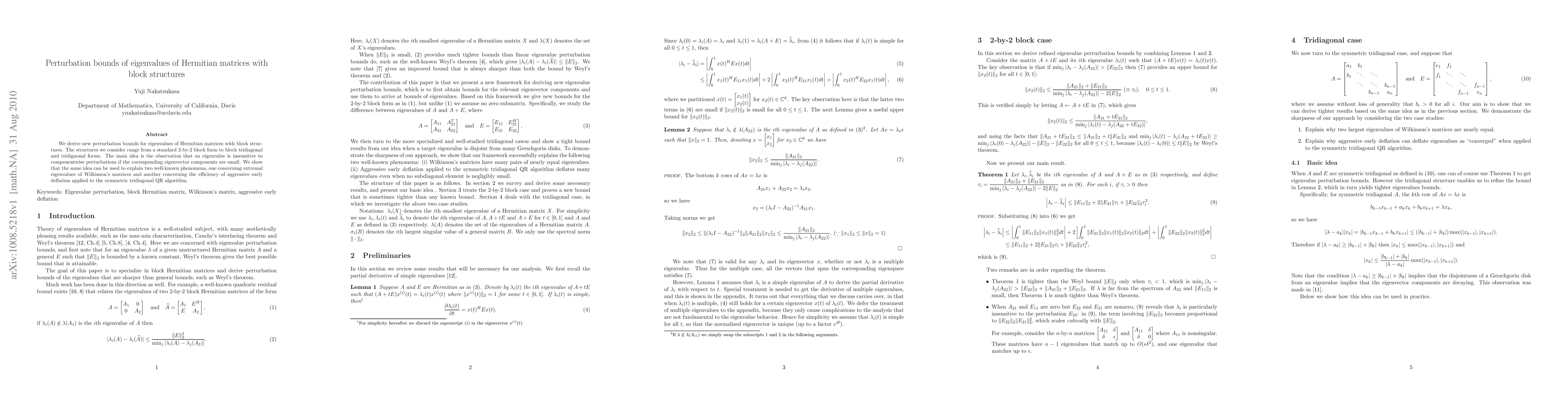 This paper derives new perturbation bounds for eigenvalues of Hermitian matrices with various block structures, showing that small eigenvector components lead to insensitivity to componentwise perturbations. It also applies this insight to explain phenomena related to extremal eigenvalues and the efficiency of the symmetric tridiagonal QR algorithm.
