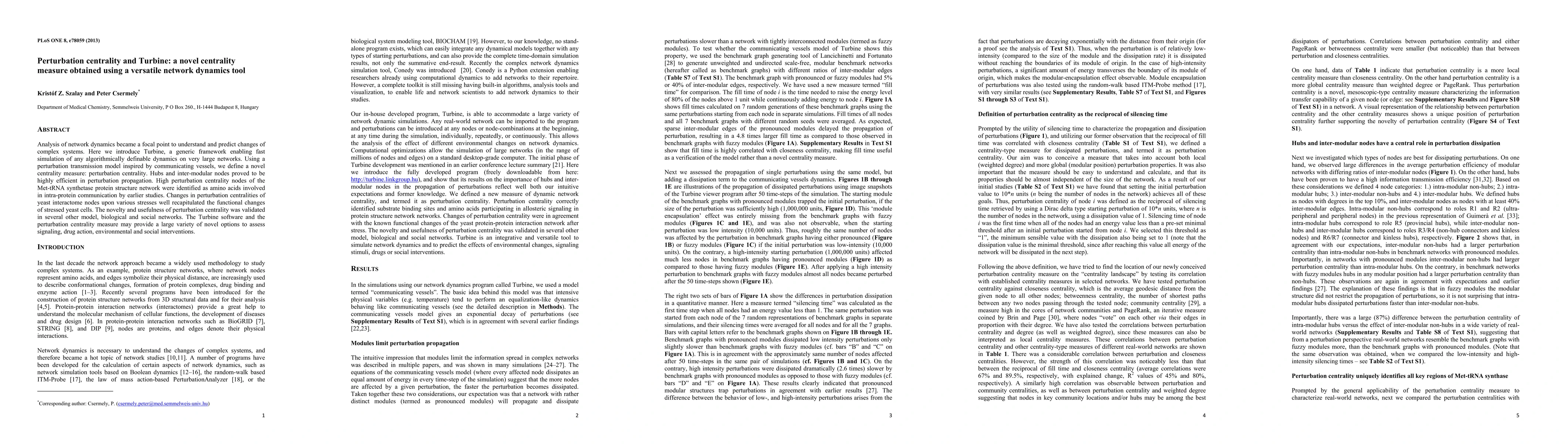 Analysis of network dynamics became a focal point to understand and predict changes of complex systems. Here we introduce Turbine, a generic framework enabling fast simulation of any algorithmically definable dynamics on very large networks. Using a perturbation transmission model inspired by communicating vessels, we define a novel centrality measure: perturbation centrality. Hubs and inter-modular nodes proved to be highly efficient in perturbation propagation. High perturbation centrality nodes of the Met-tRNA synthetase protein structure network were identified as amino acids involved in intra-protein communication by earlier studies. Changes in perturbation centralities of yeast interactome nodes upon various stresses well recapitulated the functional changes of stressed yeast cells. The novelty and usefulness of perturbation centrality was validated in several other model, biological and social networks. The Turbine software and the perturbation centrality measure may provide a large variety of novel options to assess signaling, drug action, environmental and social interventions. The Turbine algorithm is available at: http://www.turbine.linkgroup.hu