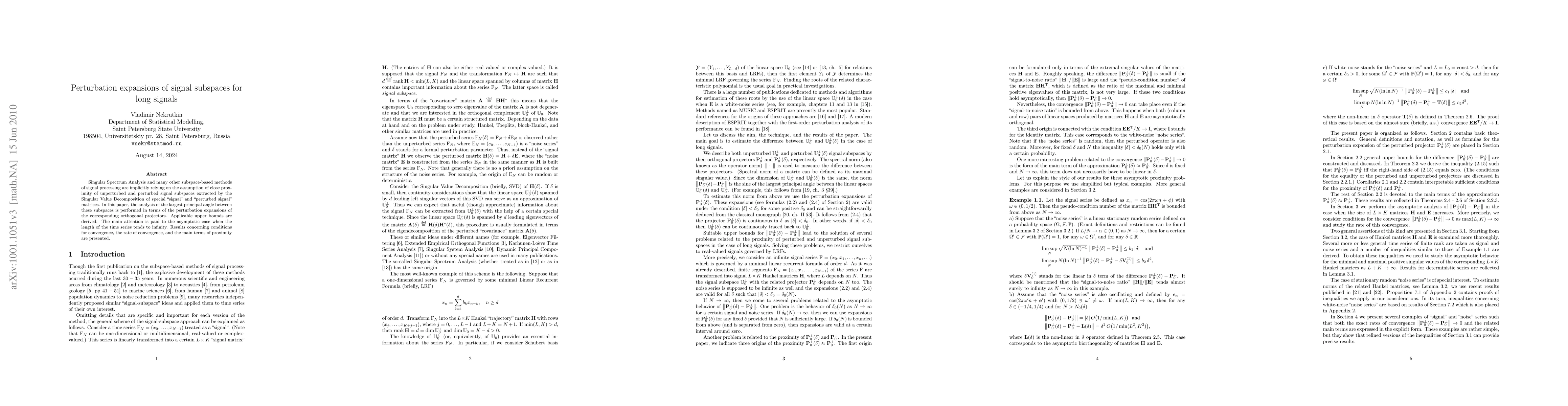 Singular Spectrum Analysis and many other subspace-based methods of signal processing are implicitly relying on the assumption of close proximity of unperturbed and perturbed signal subspaces extracted by the Singular Value Decomposition of special "signal" and "perturbed signal" matrices. In this paper, the analysis of the main principal angle between these subspaces is performed in terms of the perturbation expansions of the corresponding orthogonal projectors. Applicable upper bounds are derived. The main attention is paid to the asymptotical case when the length of the time series tends to infinity. Results concerning conditions for convergence, rate of convergence, and the main terms of proximity are presented.