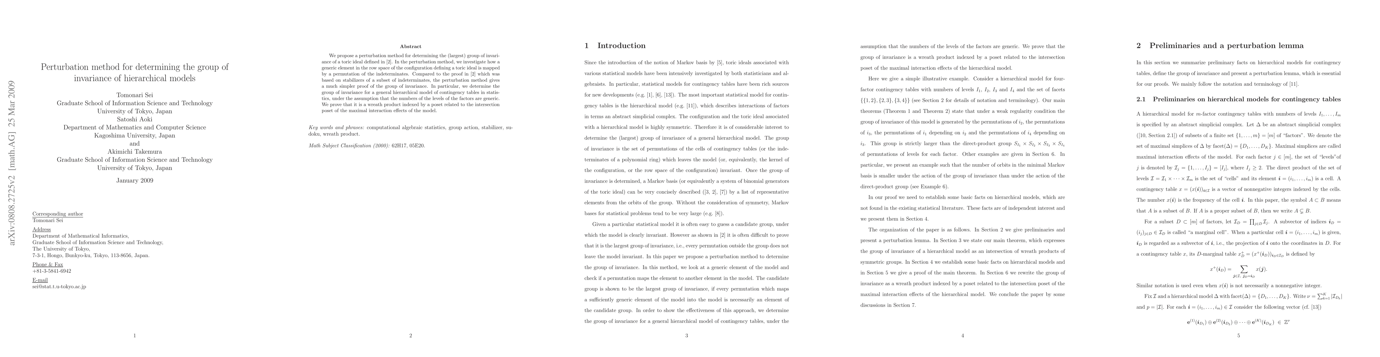 We propose a perturbation method for determining the (largest) group of invariance of a toric ideal defined in Aoki and Takemura [2008a]. In the perturbation method, we investigate how a generic element in the row space of the configuration defining a toric ideal is mapped by a permutation of the indeterminates. Compared to the proof in Aoki and Takemura [2008a] which was based on stabilizers of a subset of indeterminates, the perturbation method gives a much simpler proof of the group of invariance. In particular, we determine the group of invariance for a general hierarchical model of contingency tables in statistics, under the assumption that the numbers of the levels of the factors are generic. We prove that it is a wreath product indexed by a poset related to the intersection poset of the maximal interaction effects of the model.