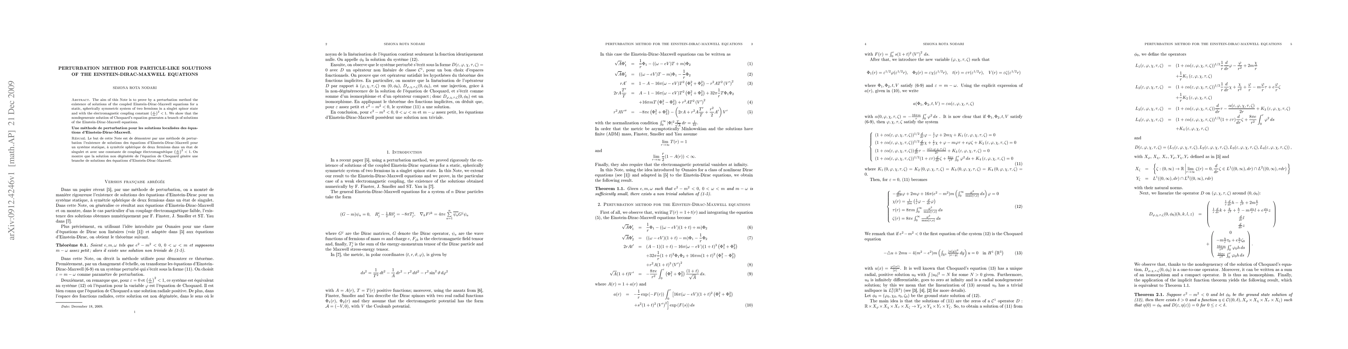 The aim of this Note is to prove by a perturbation method the existence of solutions of the coupled Einstein-Dirac-Maxwell equations for a static, spherically symmetric system of two fermions in a singlet spinor state and with the electromagnetic coupling constant $(\frac{e}{m})^2<1$. We show that the nondegenerate solution of Choquard's equation generates a branch of solutions of the Einstein-Dirac-Maxwell equations.