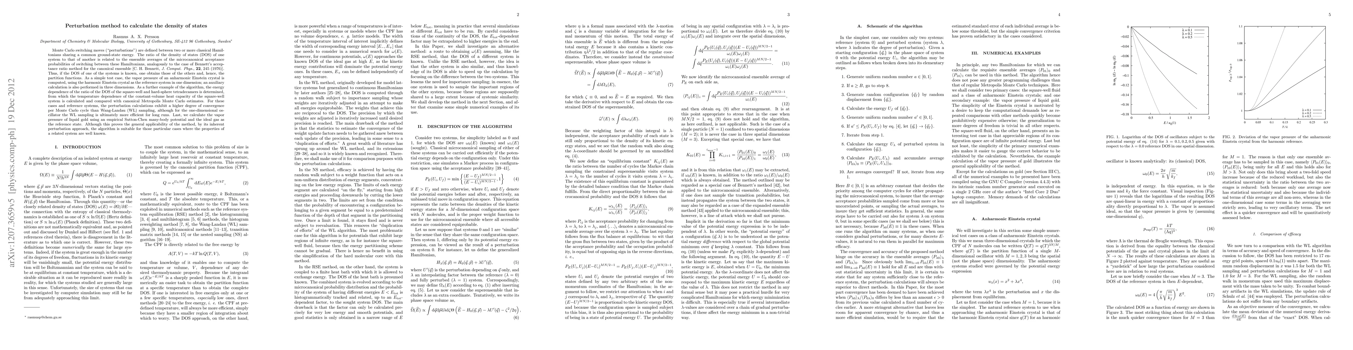 This paper introduces a Monte Carlo perturbation method to calculate the density of states (DOS) by switching between classical Hamiltonians. It demonstrates the method's efficiency in computing DOS ratios and partition functions, exemplified by vapor pressure calculations for an Einstein crystal and liquid gold, showing better convergence compared to Wang-Landau sampling for certain systems.