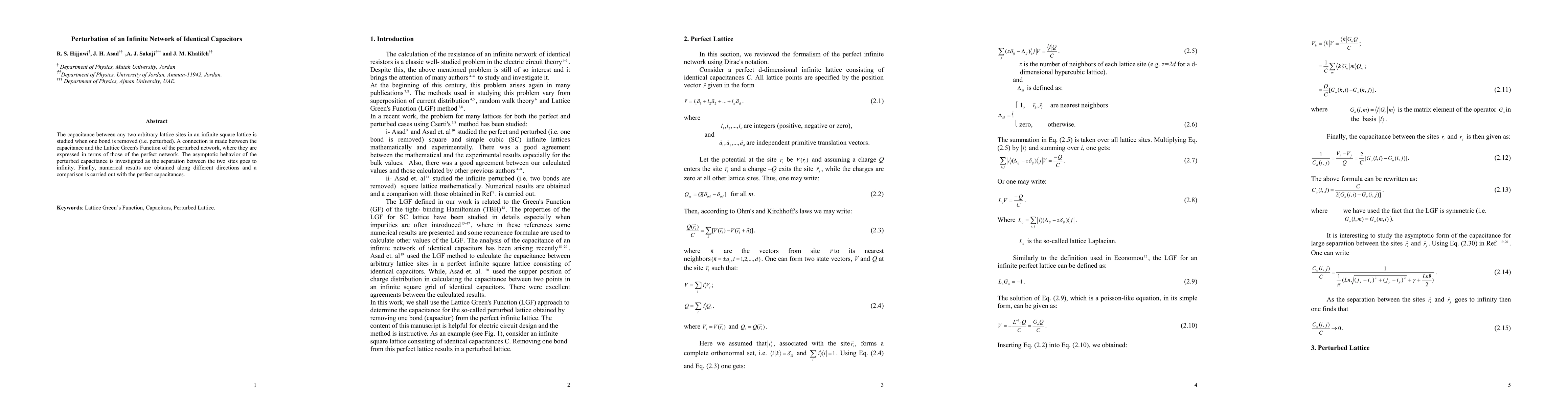 The capacitance between any two arbitrary lattice sites in an infinite square lattice is studied when one bond is removed (i.e. perturbed). A connection is made between the capacitance and the Lattice Green's Function of the perturbed network, where they are expressed in terms of those of the perfect network. The asymptotic behavior of the perturbed capacitance is investigated as the separation between the two sites goes to infinity. Finally, numerical results are obtained along different directions and a comparison is carried out with the perfect capacitances