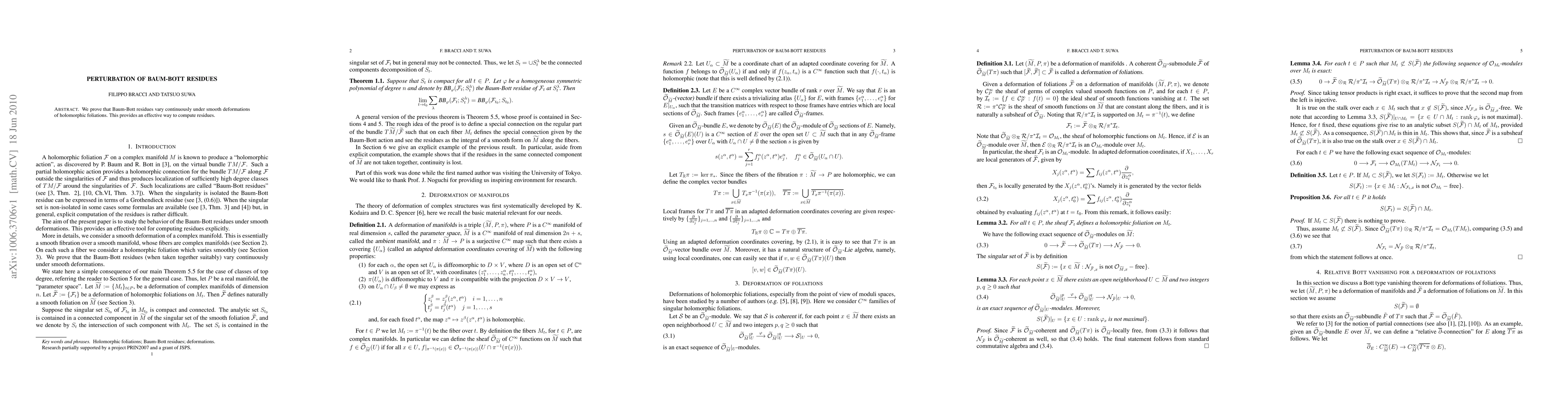 Summary: The paper demonstrates that Baum-Bott residues maintain continuity under smooth deformations of holomorphic foliations, facilitating effective residue computation.