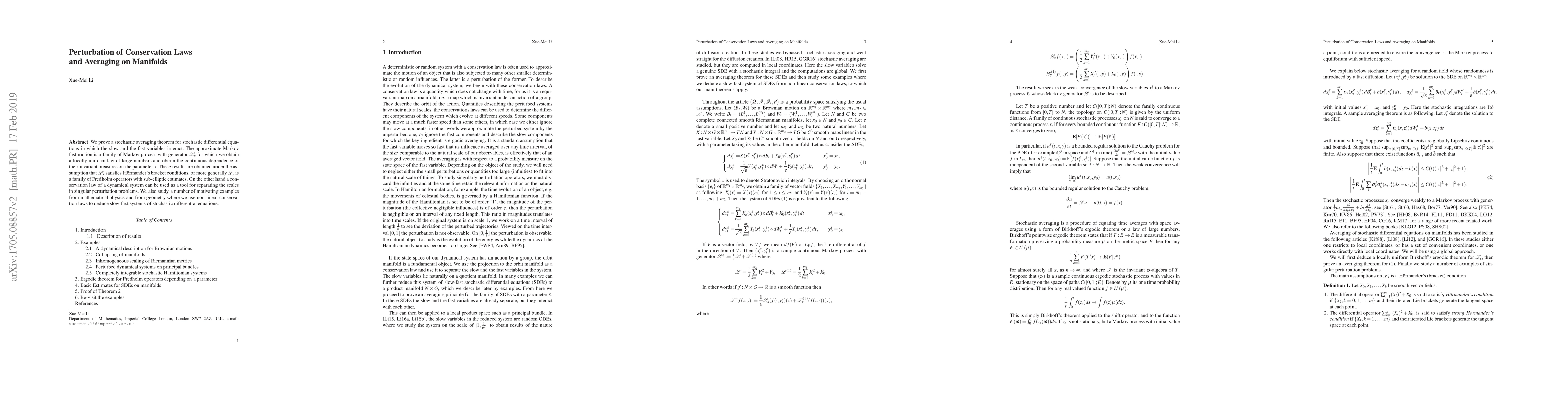 We prove a stochastic averaging theorem for stochastic differential equations in which the slow and the fast variables interact. The approximate Markov fast motion is a family of Markov process with generator ${\mathcal L}_x$ for which we obtain a locally uniform law of large numbers and obtain the continuous dependence of their invariant measures on the parameter $x$. These results are obtained under the assumption that ${\mathcal L}_x$ satisfies H\"ormander's bracket conditions, or more generally ${\mathcal L}_x$ is a family of Fredholm operators with sub-elliptic estimates. On the other hand a conservation law of a dynamical system can be used as a tool for separating the scales in singular perturbation problems. We also study a number of motivating examples from mathematical physics and from geometry where we use non-linear conservation laws to deduce slow-fast systems of stochastic differential equations.