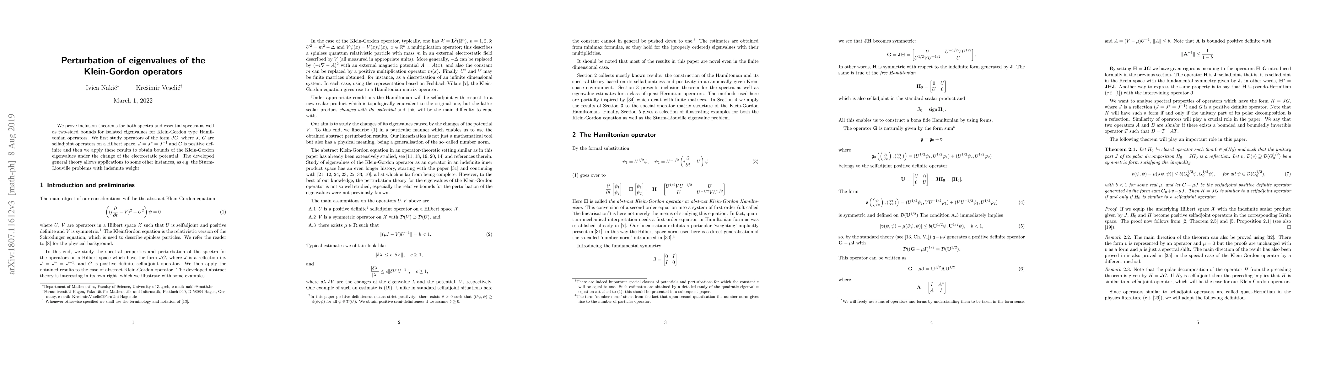 We prove inclusion theorems for both spectra and essential spectra as well as two-sided bounds for isolated eigenvalues for Klein-Gordon type Hamiltonian operators. We first study operators of the form $JG$, where $J$, $G$ are selfadjoint operators on a Hilbert space, $J = J^* = J^{-1}$ and $G$ is positive definite and then we apply these results to obtain bounds of the Klein-Gordon eigenvalues under the change of the electrostatic potential. The developed general theory allows applications to some other instances, as e.g. the Sturm-Liouville problems with indefinite weight.