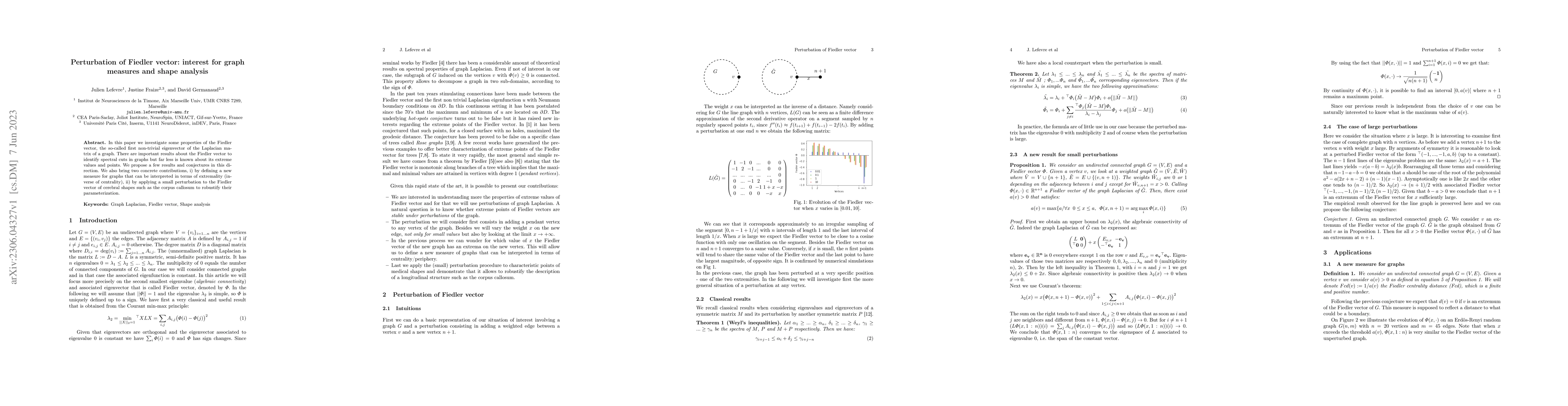 This paper explores properties of the Fiedler vector, focusing on its extreme values and points, and introduces a new graph measure linked to extremality. It also applies a perturbation to the Fiedler vector in cerebral shapes to enhance their parameterization robustness.