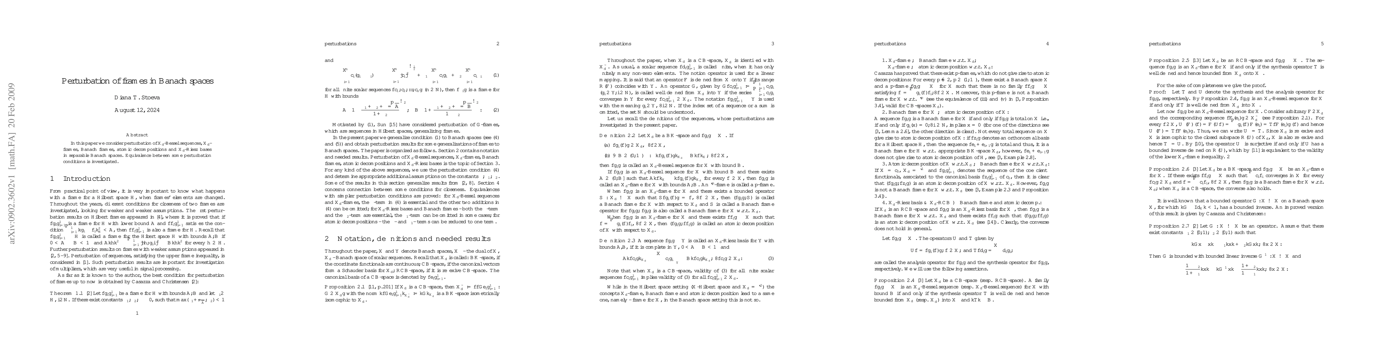 Summary: This paper examines how perturbations affect X_d-Bessel sequences, X_d-frames, Banach frames, atomic decompositions, and X_d-Riesz bases in separable Banach spaces, focusing on the equivalence of various perturbation conditions.
