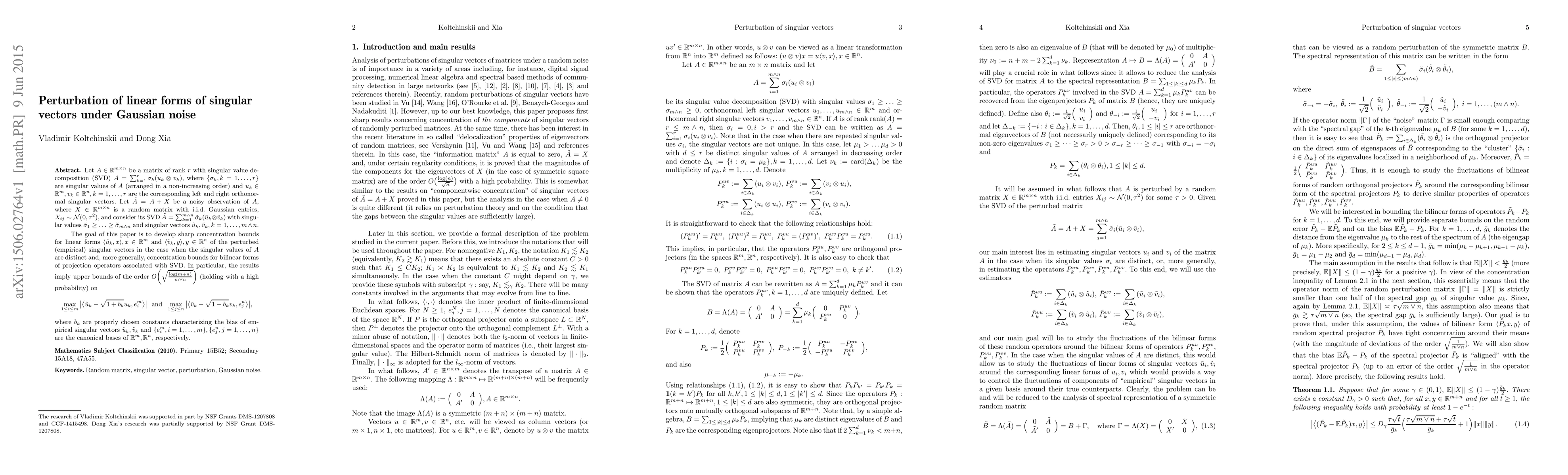 Let $A\in\mathbb{R}^{m\times n}$ be a matrix of rank $r$ with singular value decomposition (SVD) $A=\sum_{k=1}^r\sigma_k (u_k\otimes v_k),$ where $\{\sigma_k, k=1,\ldots,r\}$ are singular values of $A$ (arranged in a non-increasing order) and $u_k\in {\mathbb R}^m, v_k\in {\mathbb R}^n, k=1,\ldots, r$ are the corresponding left and right orthonormal singular vectors. Let $\tilde{A}=A+X$ be a noisy observation of $A,$ where $X\in\mathbb{R}^{m\times n}$ is a random matrix with i.i.d. Gaussian entries, $X_{ij}\sim\mathcal{N}(0,\tau^2),$ and consider its SVD $\tilde{A}=\sum_{k=1}^{m\wedge n}\tilde{\sigma}_k(\tilde{u}_k\otimes\tilde{v}_k)$ with singular values $\tilde{\sigma}_1\geq\ldots\geq\tilde{\sigma}_{m\wedge n}$ and singular vectors $\tilde{u}_k,\tilde{v}_k,k=1,\ldots, m\wedge n.$ The goal of this paper is to develop sharp concentration bounds for linear forms $\langle \tilde u_k,x\rangle, x\in {\mathbb R}^m$ and $\langle \tilde v_k,y\rangle, y\in {\mathbb R}^n$ of the perturbed (empirical) singular vectors in the case when the singular values of $A$ are distinct and, more generally, concentration bounds for bilinear forms of projection operators associated with SVD. In particular, the results imply upper bounds of the order $O\biggl(\sqrt{\frac{\log(m+n)}{m\vee n}}\biggr)$ (holding with a high probability) on $$\max_{1\leq i\leq m}\big|\big<\tilde{u}_k-\sqrt{1+b_k}u_k,e_i^m\big>\big|\ \ {\rm and} \ \ \max_{1\leq j\leq n}\big|\big<\tilde{v}_k-\sqrt{1+b_k}v_k,e_j^n\big>\big|,$$ where $b_k$ are properly chosen constants characterizing the bias of empirical singular vectors $\tilde u_k, \tilde v_k$ and $\{e_i^m,i=1,\ldots,m\}, \{e_j^n,j=1,\ldots,n\}$ are the canonical bases of $\mathbb{R}^m, {\mathbb R}^n,$ respectively.