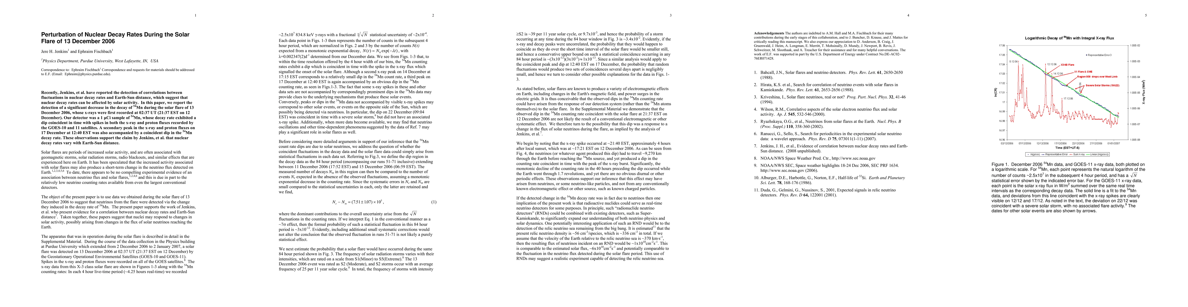 This paper reports a significant decrease in the decay rate of 54Mn during the solar flare on 13 December 2006, coinciding with spikes in x-ray and proton fluxes, supporting the hypothesis that solar activity can perturb nuclear decay rates. The findings align with previous observations suggesting a correlation between Earth-Sun distance and nuclear decay rates.