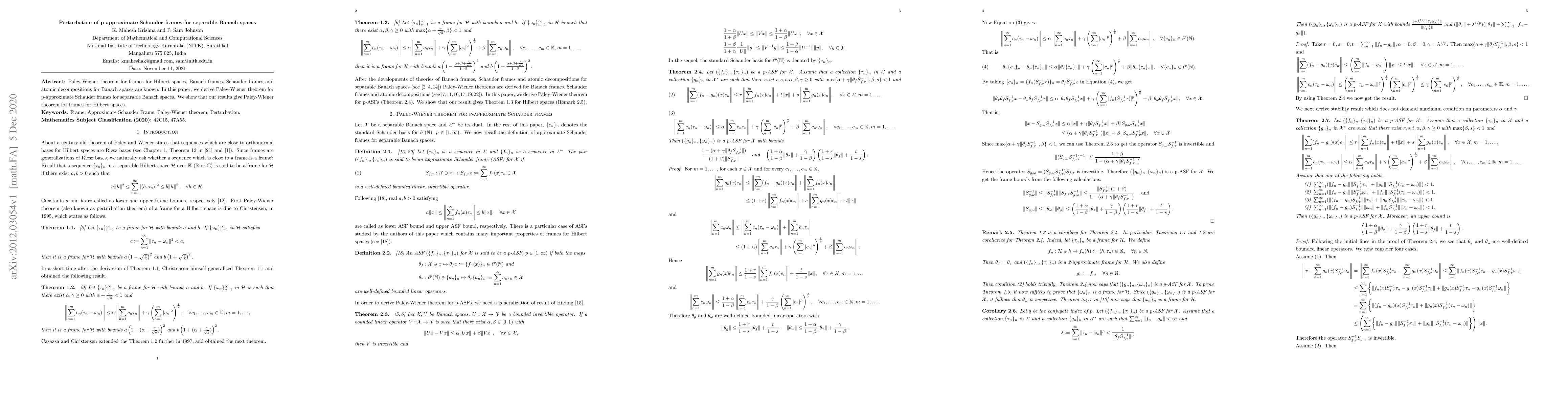 This paper derives the Paley-Wiener theorem for p-approximate Schauder frames in separable Banach spaces, extending existing results to this new context and demonstrating its applicability to frames in Hilbert spaces.