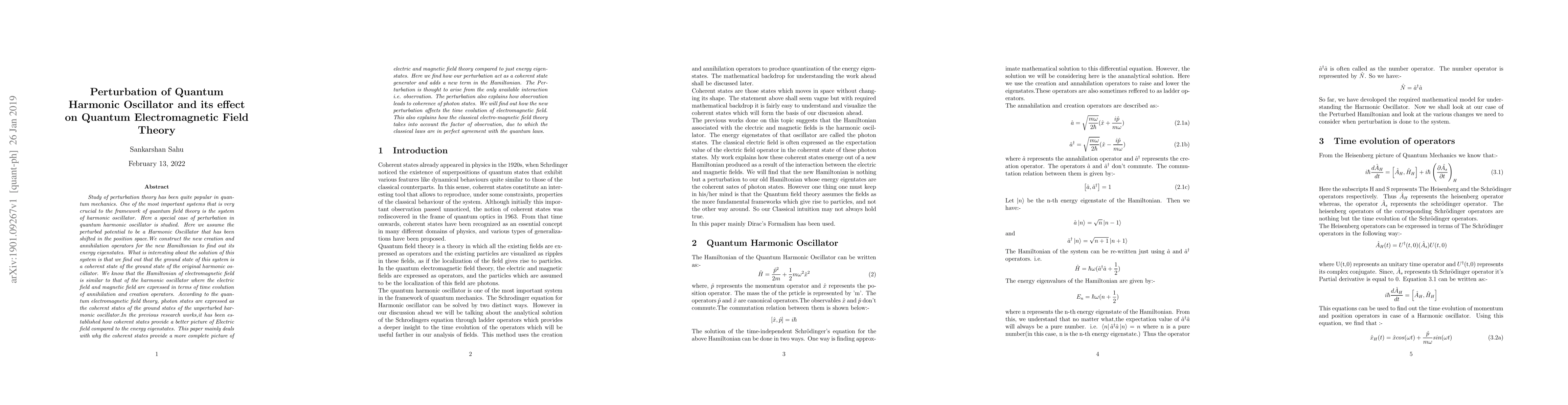 Here a special case of perturbation in quantum harmonic oscillator is studied. Here we assume the perturbed potential to be a Harmonic Oscillator that has been shifted in the position space.We construct the new creation and annihilation operators for the new Hamiltonian to find out its energy eigenstates. What is interesting about the solution of this system is that we find out that the ground state of this system is a coherent state of the ground state of the original harmonic oscillator. We know that the Hamiltonian of electromagnetic field is similar to that of the harmonic oscillator where the electric field and magnetic field are expressed in terms of time evolution of annihilation and creation operators. According to the quantum electromagnetic field theory, photon states are expressed as the coherent states of the ground states of the unperturbed harmonic oscillator.In the previous research works,it has been established how coherent states provide a better picture of Electric field compared to the energy eigenstates. This paper mainly deals with why the coherent states provide a more complete picture of electric and magnetic field theory compared to just energy eigenstates. Here we find how our perturbation act as a coherent state generator and adds a new term in the Hamiltonian. The Perturbation is thought to arise from the only available interaction i.e. observation. The perturbation also explains how observation leads to coherence of photon states. We will find out how the new perturbation affects the time evolution of electromagnetic field. This also explains how the classical electromagnetic field theory takes into account the factor of observation, due to which the classical laws are in perfect agreement with the quantum laws.