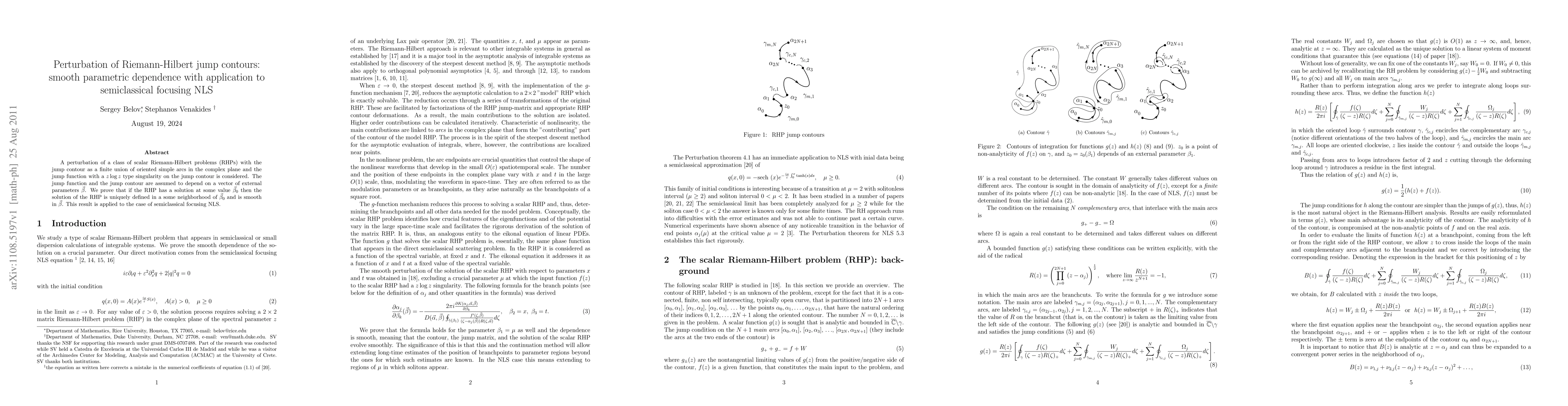 A perturbation of a class of scalar Riemann-Hilbert problems (RHPs) with the jump contour as a finite union of oriented simple arcs in the complex plane and the jump function with a $z\log z$ type singularity on the jump contour is considered. The jump function and the jump contour are assumed to depend on a vector of external parameters $\vec\beta$. We prove that if the RHP has a solution at some value $\vec\beta_0$ then the solution of the RHP is uniquely defined in a some neighborhood of $\vec\beta_0$ and is smooth in $\vec\beta$. This result is applied to the case of semiclassical focusing NLS.
