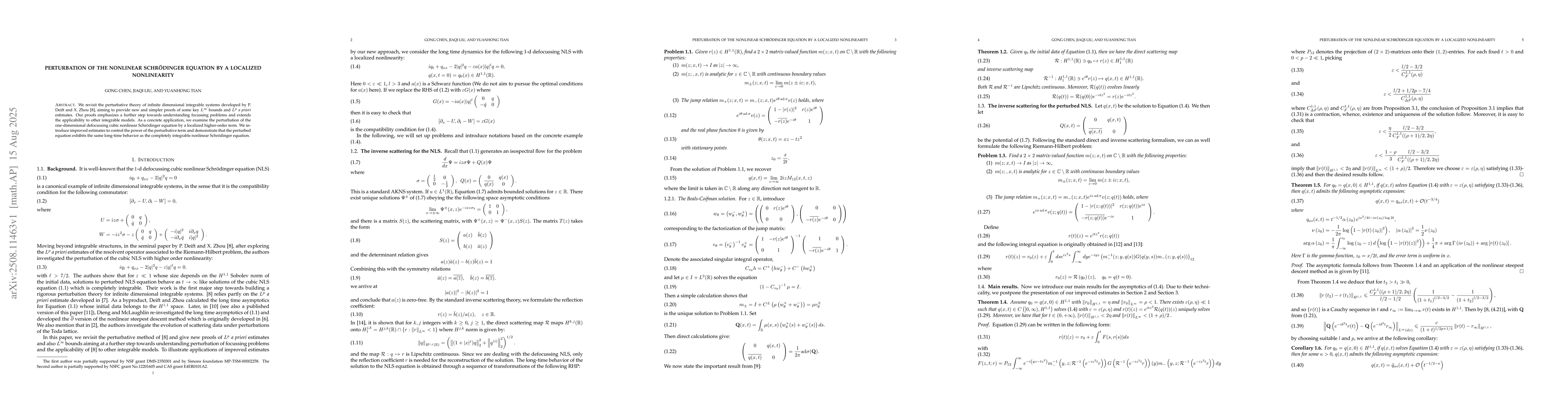 We revisit the perturbative theory of infinite dimensional integrable systems developed by P. Deift and X. Zhou \cite{DZ-2}, aiming to provide new and simpler proofs of some key $L^\infty$ bounds and $L^p$ \emph{\textit{a priori}} estimates. Our proofs emphasizes a further step towards understanding focussing problems and extends the applicability to other integrable models. As a concrete application, we examine the perturbation of the one-dimensional defocussing cubic nonlinear Schr\"odinger equation by a localized higher-order term. We introduce improved estimates to control the power of the perturbative term and demonstrate that the perturbed equation exhibits the same long-time behavior as the completely integrable nonlinear Schr\"odinger equation.