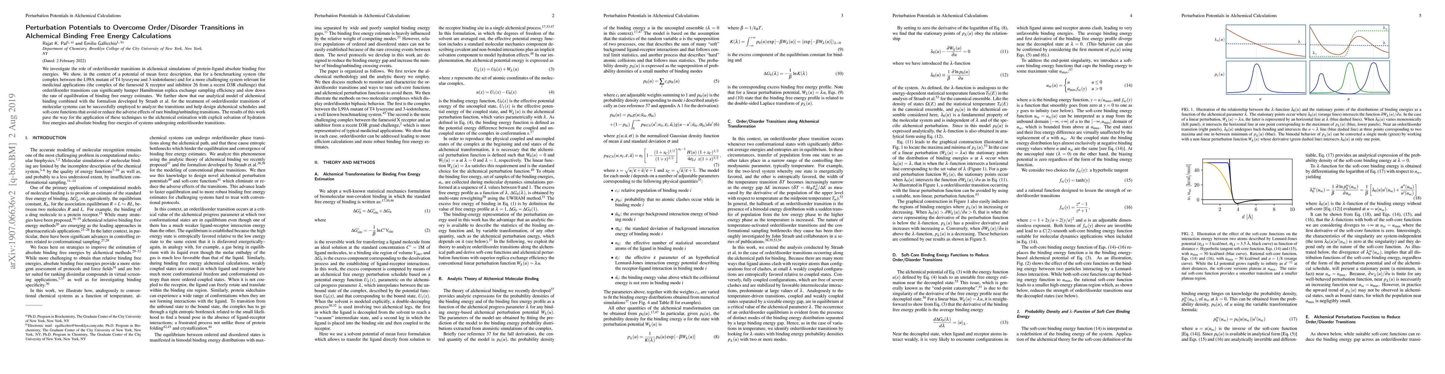 This paper explores how order/disorder transitions impact alchemical binding free energy calculations, demonstrating that these transitions can hinder sampling efficiency and equilibration. It proposes analytical models and perturbation potentials to mitigate these effects, paving the way for improved alchemical methods in complex systems.