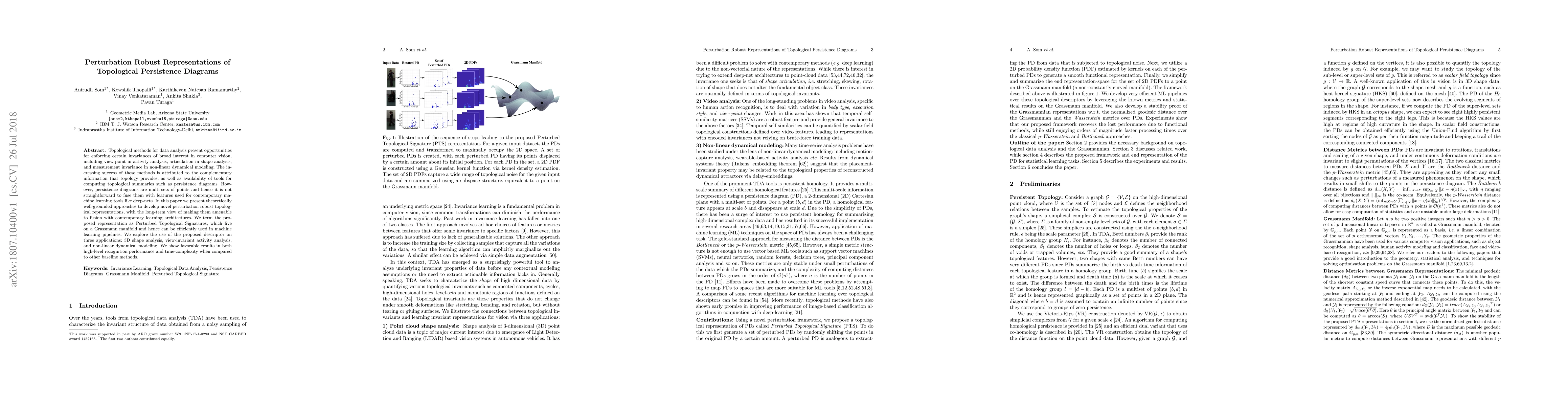 Topological methods for data analysis present opportunities for enforcing certain invariances of broad interest in computer vision, including view-point in activity analysis, articulation in shape analysis, and measurement invariance in non-linear dynamical modeling. The increasing success of these methods is attributed to the complementary information that topology provides, as well as availability of tools for computing topological summaries such as persistence diagrams. However, persistence diagrams are multi-sets of points and hence it is not straightforward to fuse them with features used for contemporary machine learning tools like deep-nets. In this paper we present theoretically well-grounded approaches to develop novel perturbation robust topological representations, with the long-term view of making them amenable to fusion with contemporary learning architectures. We term the proposed representation as Perturbed Topological Signatures, which live on a Grassmann manifold and hence can be efficiently used in machine learning pipelines. We explore the use of the proposed descriptor on three applications: 3D shape analysis, view-invariant activity analysis, and non-linear dynamical modeling. We show favorable results in both high-level recognition performance and time-complexity when compared to other baseline methods.