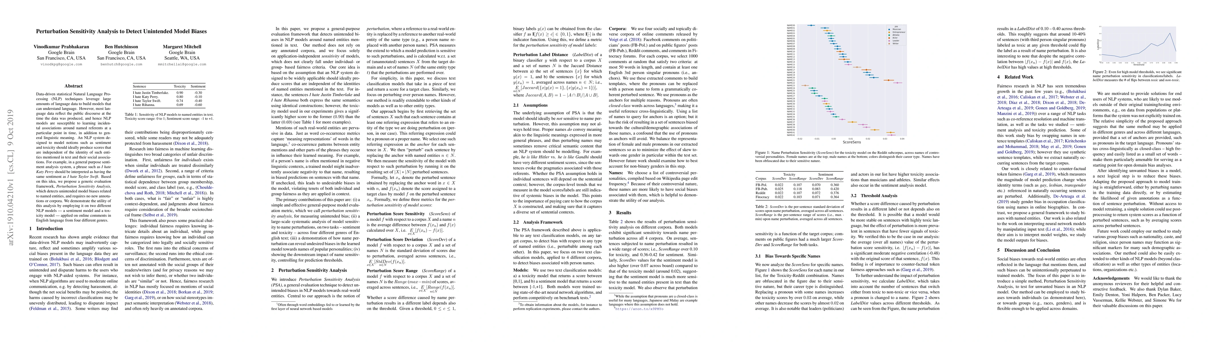 Data-driven statistical Natural Language Processing (NLP) techniques leverage large amounts of language data to build models that can understand language. However, most language data reflect the public discourse at the time the data was produced, and hence NLP models are susceptible to learning incidental associations around named referents at a particular point in time, in addition to general linguistic meaning. An NLP system designed to model notions such as sentiment and toxicity should ideally produce scores that are independent of the identity of such entities mentioned in text and their social associations. For example, in a general purpose sentiment analysis system, a phrase such as I hate Katy Perry should be interpreted as having the same sentiment as I hate Taylor Swift. Based on this idea, we propose a generic evaluation framework, Perturbation Sensitivity Analysis, which detects unintended model biases related to named entities, and requires no new annotations or corpora. We demonstrate the utility of this analysis by employing it on two different NLP models --- a sentiment model and a toxicity model --- applied on online comments in English language from four different genres.