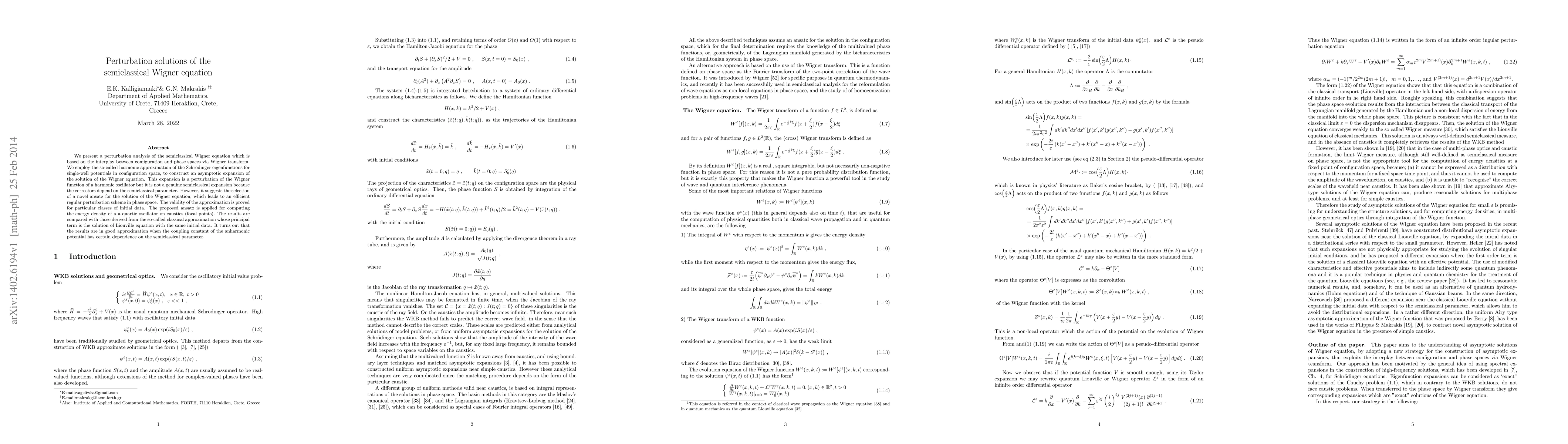 We present a perturbation analysis of the semiclassical Wigner equation which is based on the interplay between configuration and phase spaces via Wigner transform. We employ the so-called harmonic approximation of the Schrodinger eigenfunctions for single-well potentials in configuration space, to construct an asymptotic expansion of the solution of the Wigner equation. This expansion is a perturbation of the Wigner function of a harmonic oscillator but it is not a genuine semiclassical expansion because the correctors depend on the semiclassical parameter. However, it suggests the selection of a novel ansatz for the solution of the Wigner equation, which leads to an efficient regular perturbation scheme in phase space. The validity of the approximation is proved for particular classes of initial data. The proposed ansatz is applied for computing the energy density of a a quartic oscillator on caustics (focal points). The results are compared with those derived from the so-called classical approximation whose principal term is the solution of Liouville equation with the same initial data. It turns out that the results are in good approximation when the coupling constant of the anharmonic potential has certain dependence on the semiclassical parameter.