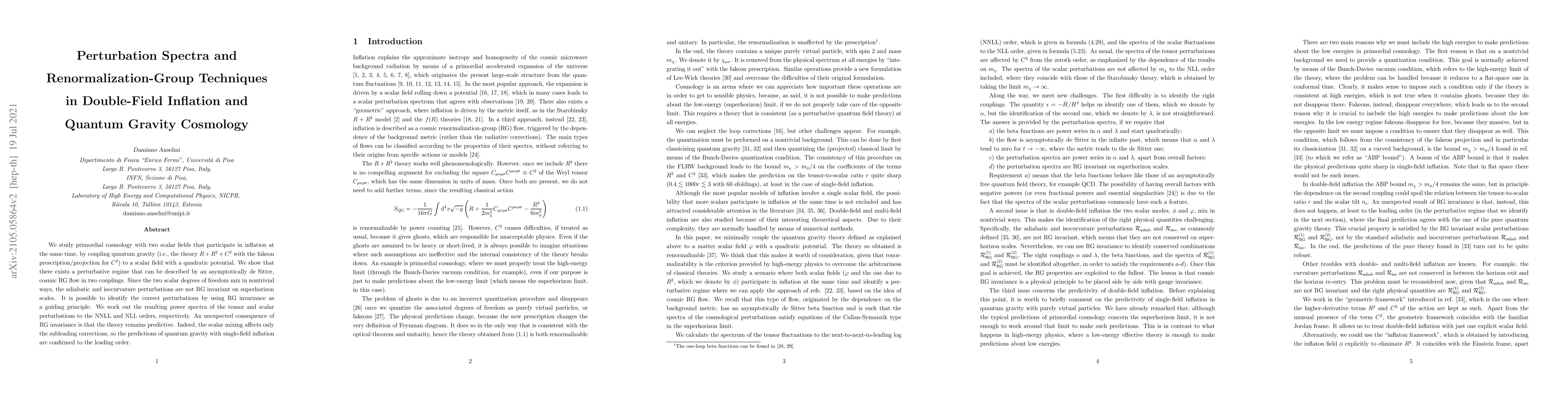 We study primordial cosmology with two scalar fields that participate in inflation at the same time, by coupling quantum gravity (i.e., the theory $R+R^{2}+C^{2}$ with the fakeon prescription/projection for $C^{2}$) to a scalar field with a quadratic potential. We show that there exists a perturbative regime that can be described by an asymptotically de Sitter, cosmic RG flow in two couplings. Since the two scalar degrees of freedom mix in nontrivial ways, the adiabatic and isocurvature perturbations are not RG invariant on superhorizon scales. It is possible to identify the correct perturbations by using RG invariance as a guiding principle. We work out the resulting power spectra of the tensor and scalar perturbations to the NNLL and NLL orders, respectively. An unexpected consequence of RG invariance is that the theory remains predictive. Indeed, the scalar mixing affects only the subleading corrections, so the predictions of quantum gravity with single-field inflation are confirmed to the leading order.