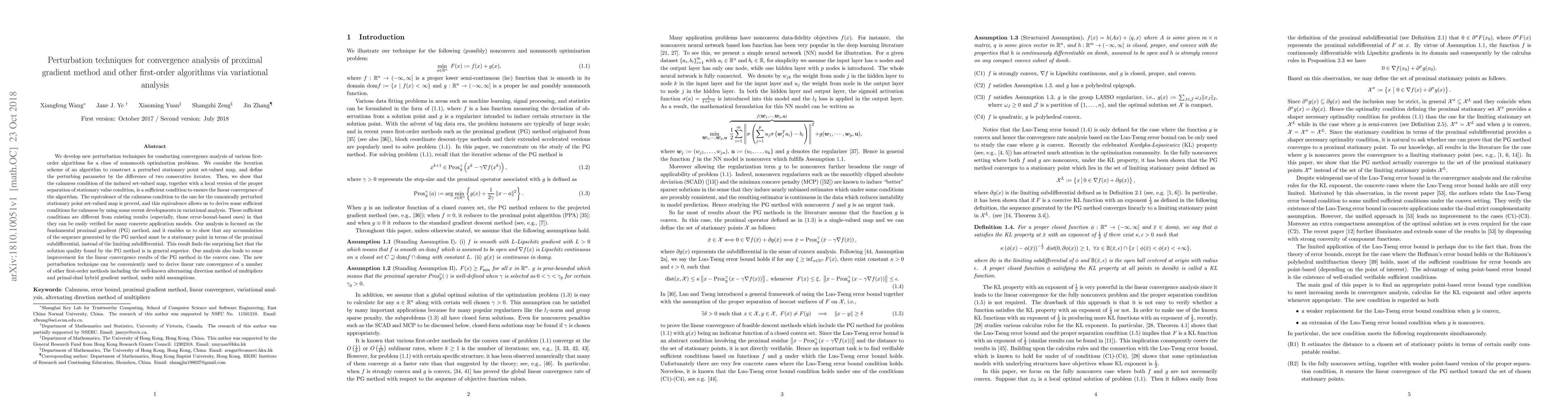 We develop new perturbation techniques for conducting convergence analysis of various first-order algorithms for a class of nonsmooth optimization problems. We consider the iteration scheme of an algorithm to construct a perturbed stationary point set-valued map, and define the perturbing parameter by the difference of two consecutive iterates. Then, we show that the calmness condition of the induced set-valued map, together with a local version of the proper separation of stationary value condition, is a sufficient condition to ensure the linear convergence of the algorithm. The equivalence of the calmness condition to the one for the canonically perturbed stationary point set-valued map is proved, and this equivalence allows us to derive some sufficient conditions for calmness by using some recent developments in variational analysis. These sufficient conditions are different from existing results (especially, those error-bound-based ones) in that they can be easily verified for many concrete application models. Our analysis is focused on the fundamental proximal gradient (PG) method, and it enables us to show that any accumulation of the sequence generated by the PG method must be a stationary point in terms of the proximal subdifferential, instead of the limiting subdifferential. This result finds the surprising fact that the solution quality found by the PG method is in general superior. Our analysis also leads to some improvement for the linear convergence results of the PG method in the convex case. The new perturbation technique can be conveniently used to derive linear rate convergence of a number of other first-order methods including the well-known alternating direction method of multipliers and primal-dual hybrid gradient method, under mild assumptions.